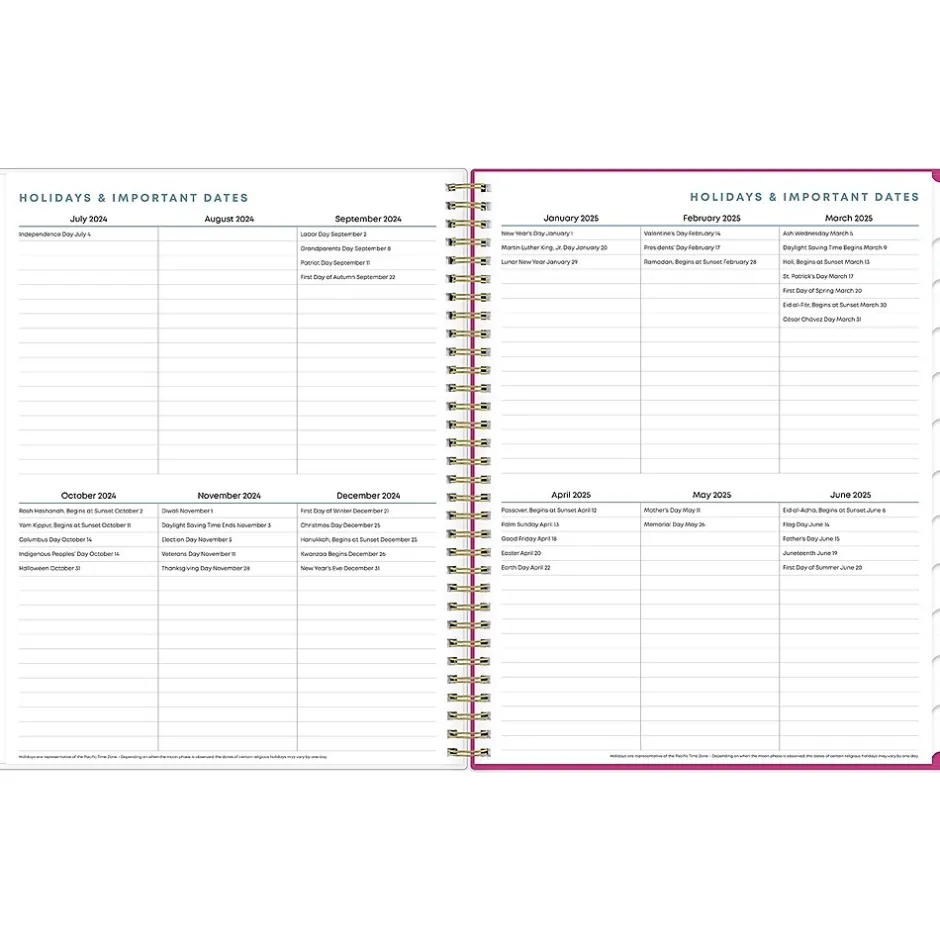 - Weekly and monthly planner covers a 12-month academic date range from July 2024 to June 2025