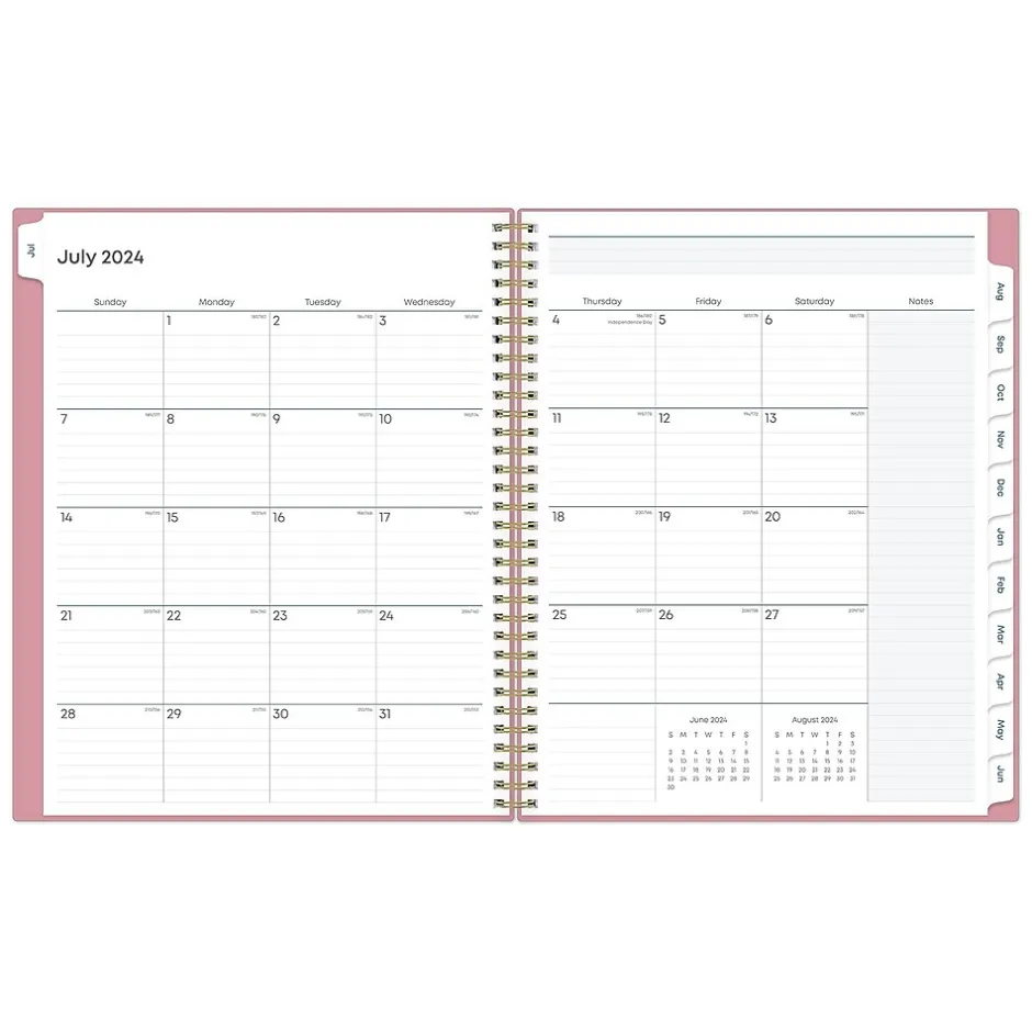 - Features one month per two pages and one week per two pages, with space for notes and quick reference calendars