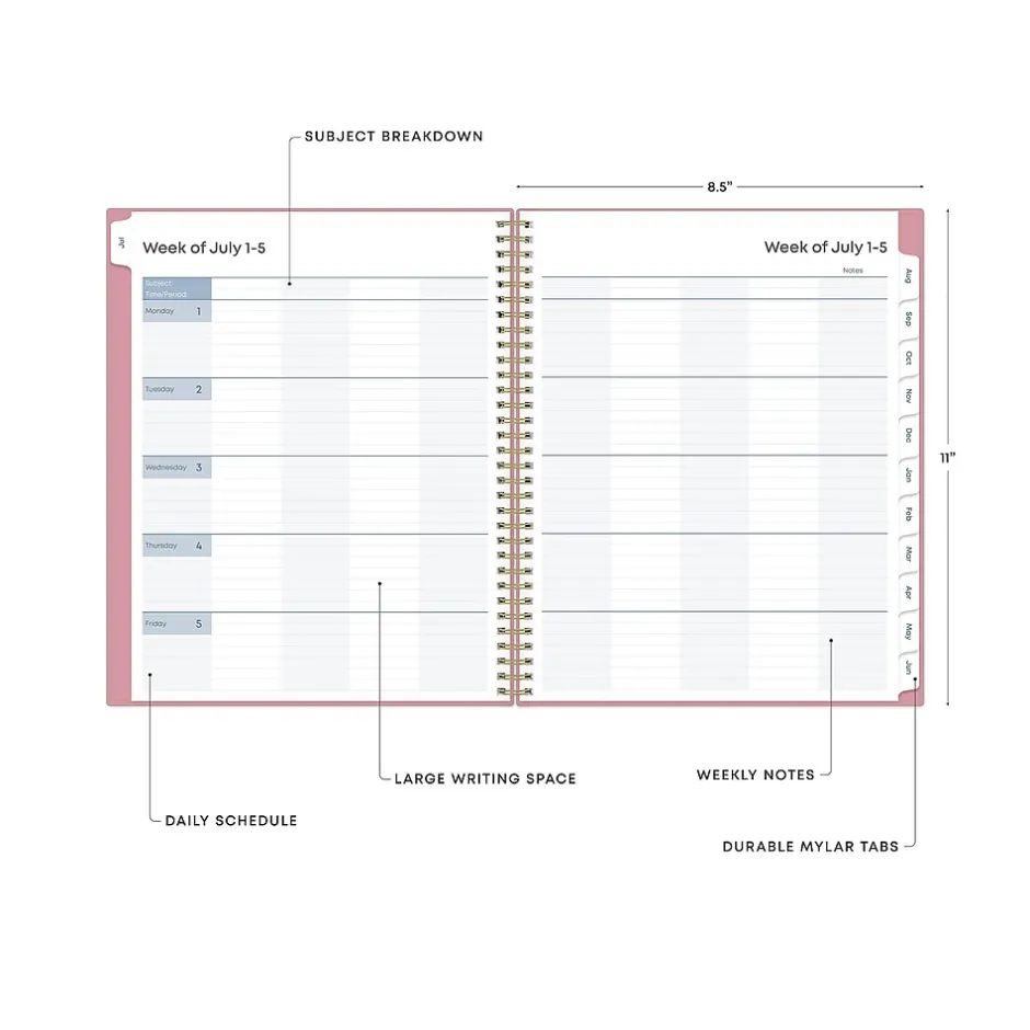 This Blue Sky Teacher Lesson planner keeps you focused and organized. This academic planner has weekly planning space for up to nine classes or subjects. Monthly pages are tabbed and offer plenty of room for notes. Extras include a storage pocket and pages for weekly activities, class birthdays, and holidays.
