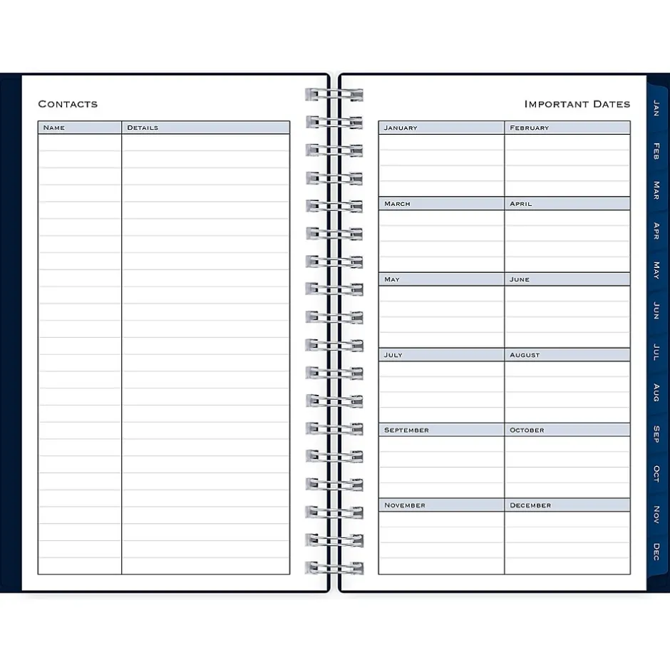 - One month per view, one week per view, to-do section checkbox, two-year calendar, notes pages, goals, contacts, and important dates