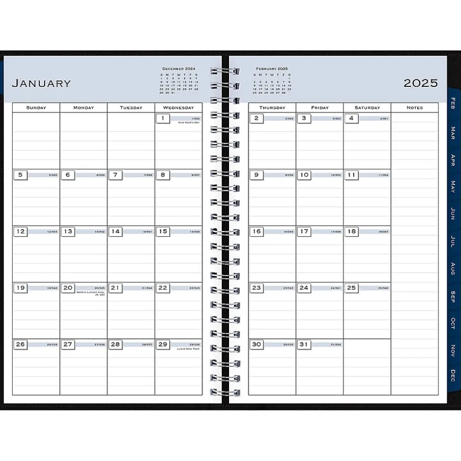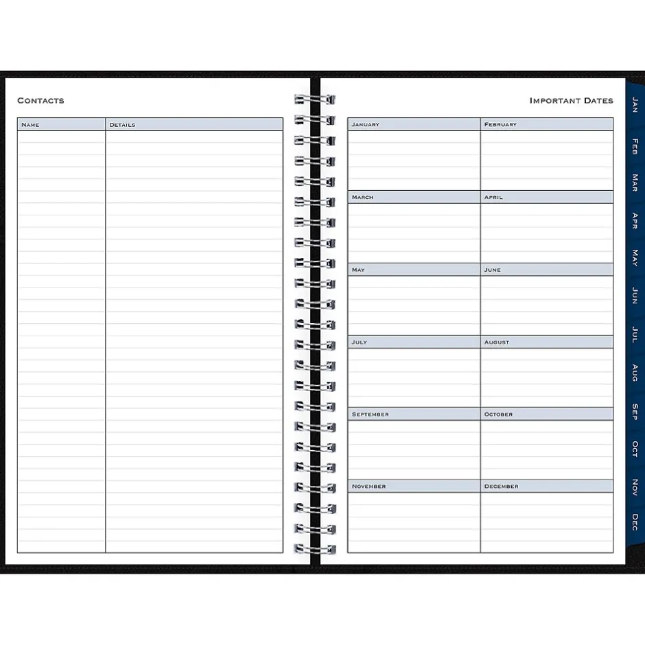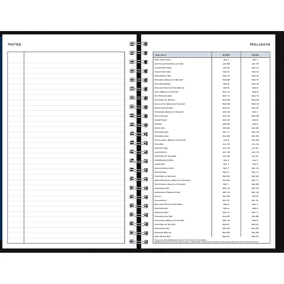 - Offers one week per two pages and one month per two pages, with space for notes and quick reference calendars