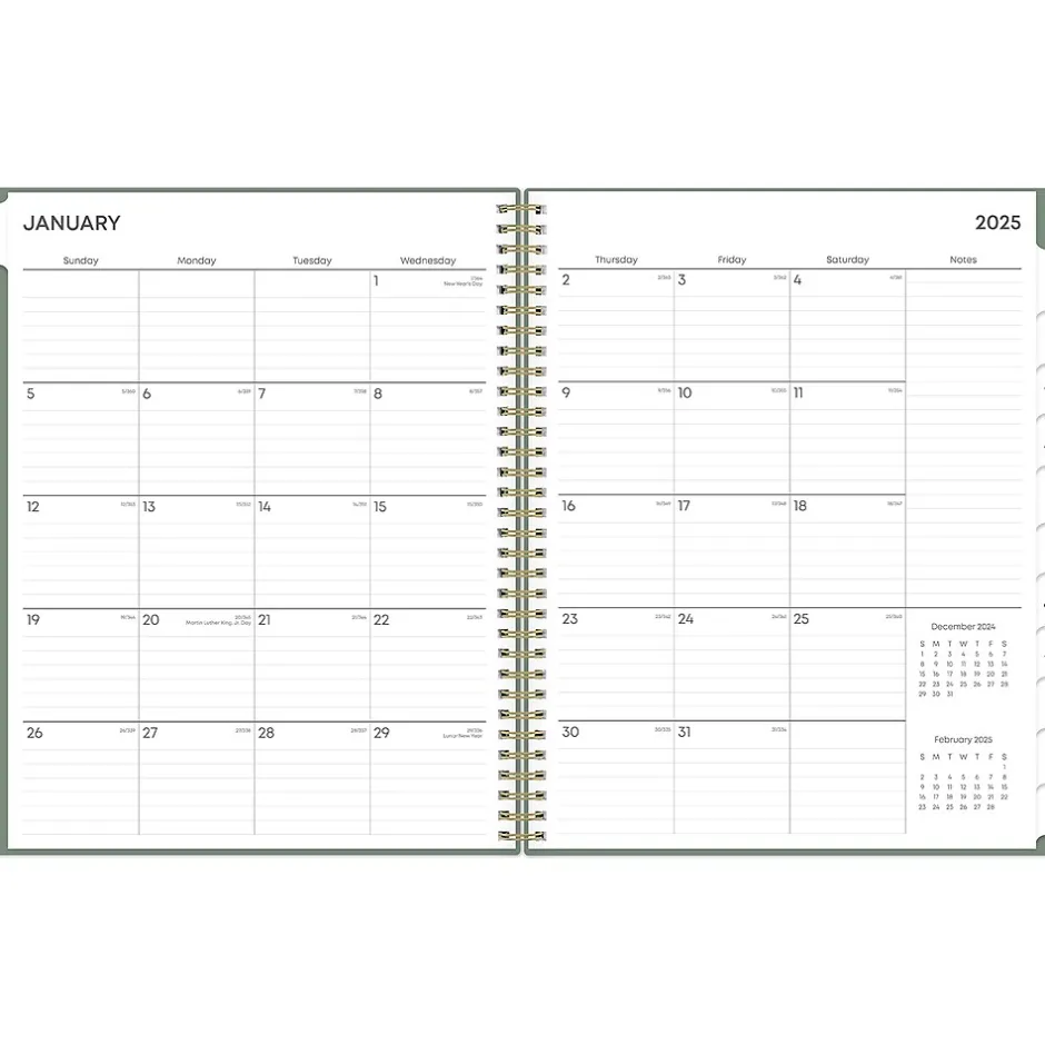 - Weekly and monthly planner covers 12 months from January 2025 to December 2025