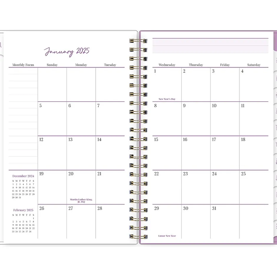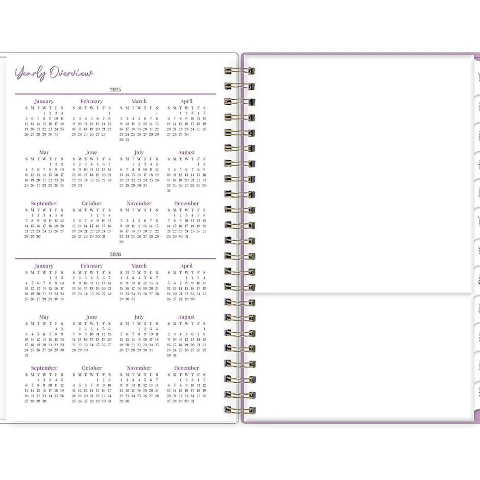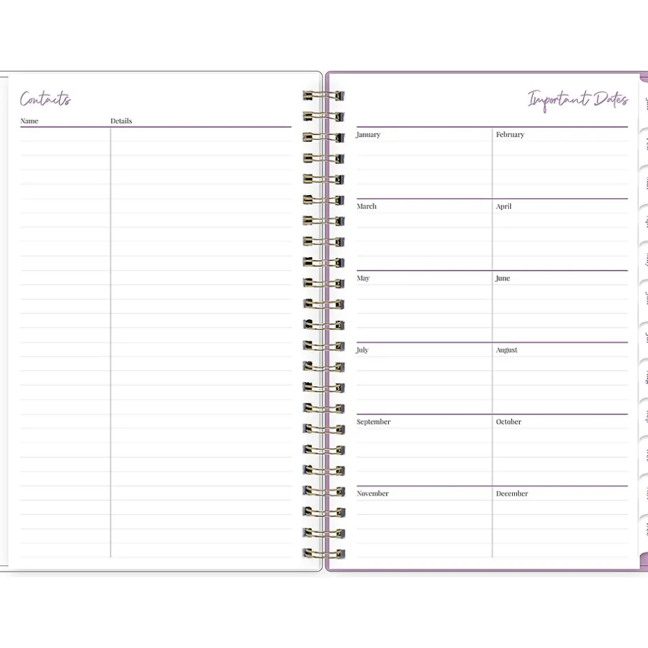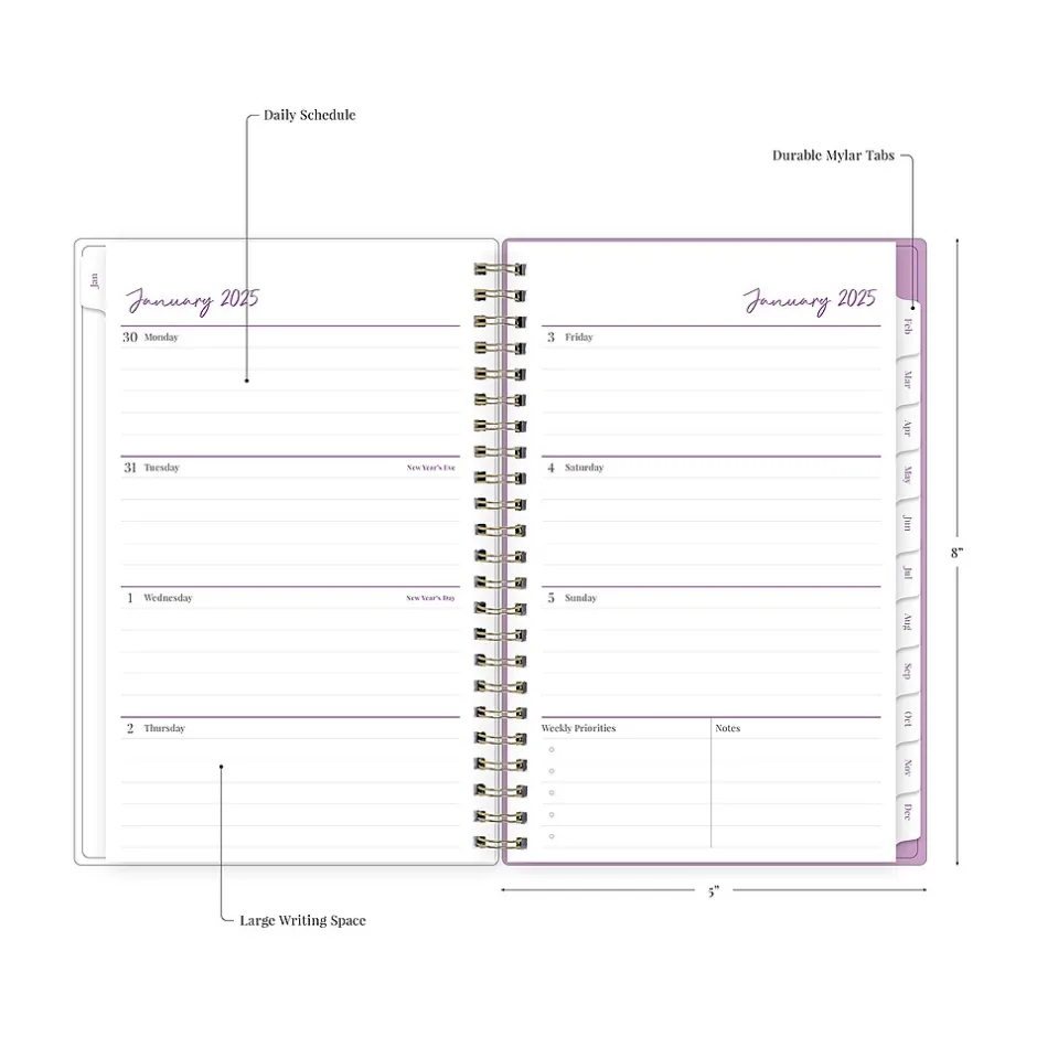 Organize tasks and time with the 2025 Ella Bloom weekly and monthly planner from Britt Mills for Blue Sky. It features a clear storage pocket to keep everything together and includes weekly layouts, tabbed monthly views, and notes pages to help you manage your schedule and achieve your goals.