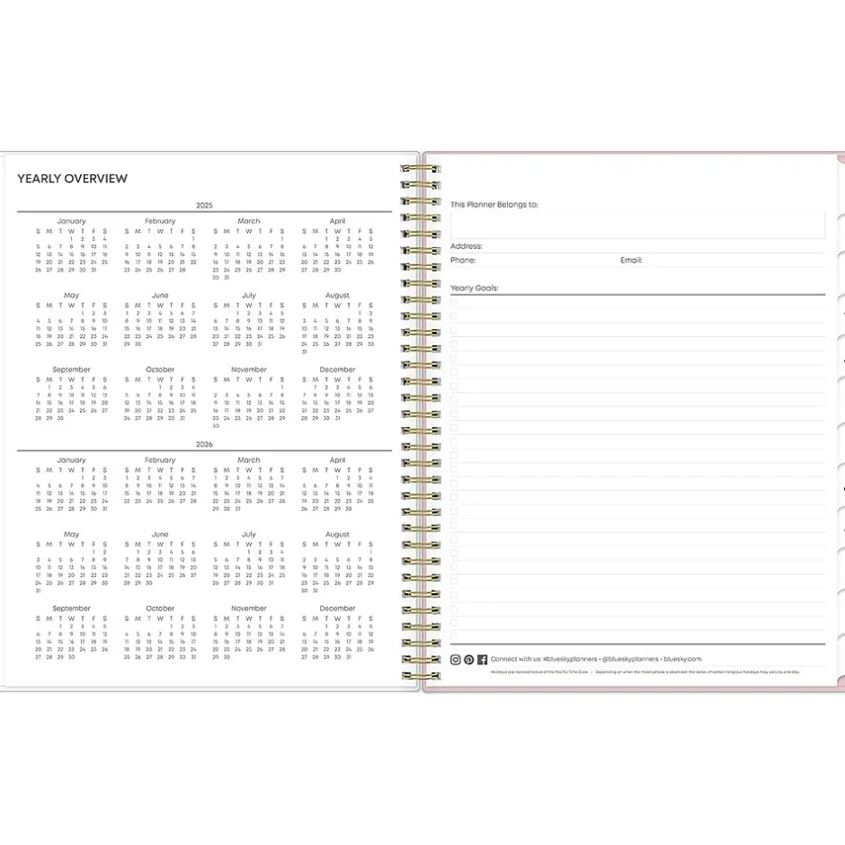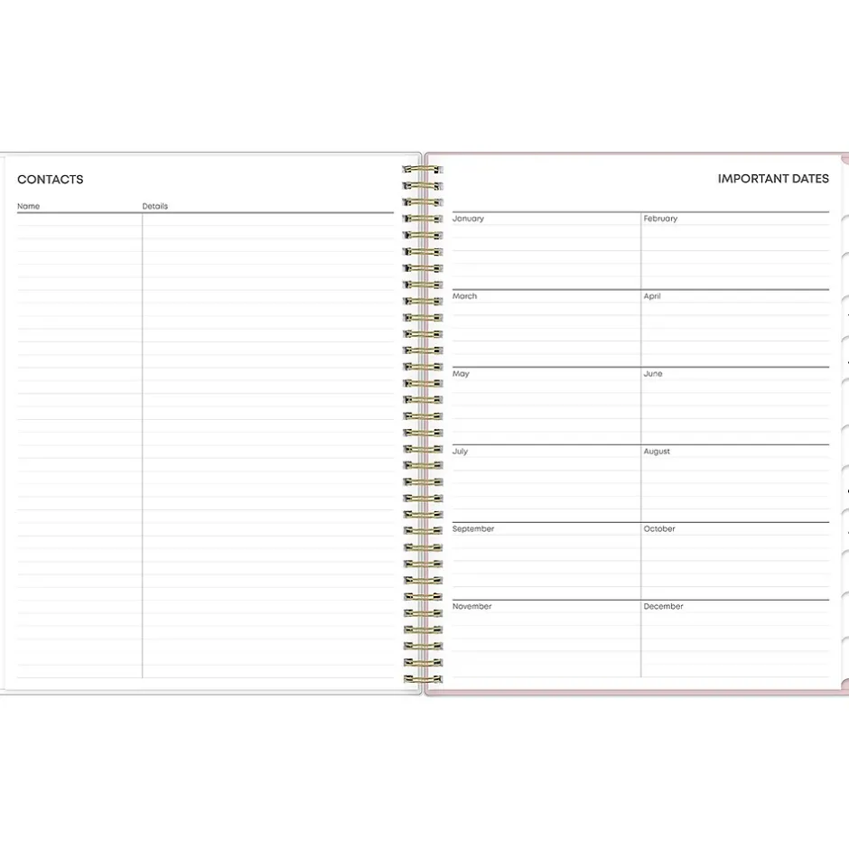 - Yearly overview, list of major holidays, and pages for your contacts, goals, important dates, and notes