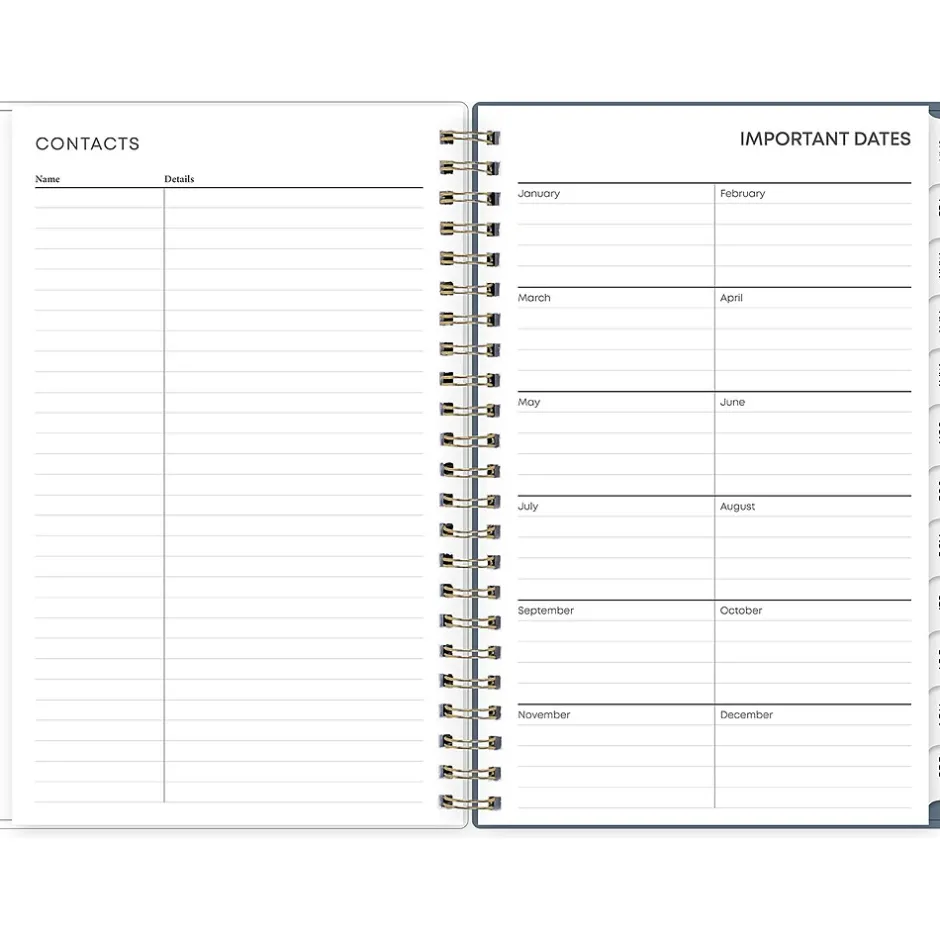 - Yearly overview, list of major holidays, and pages for your contacts, goals, important dates, and notes