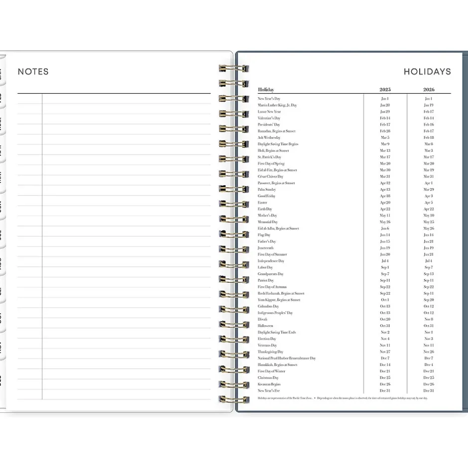 - Features two-page vertical appointment-style weekly and monthly spreads, with space for notes and quick reference calendars