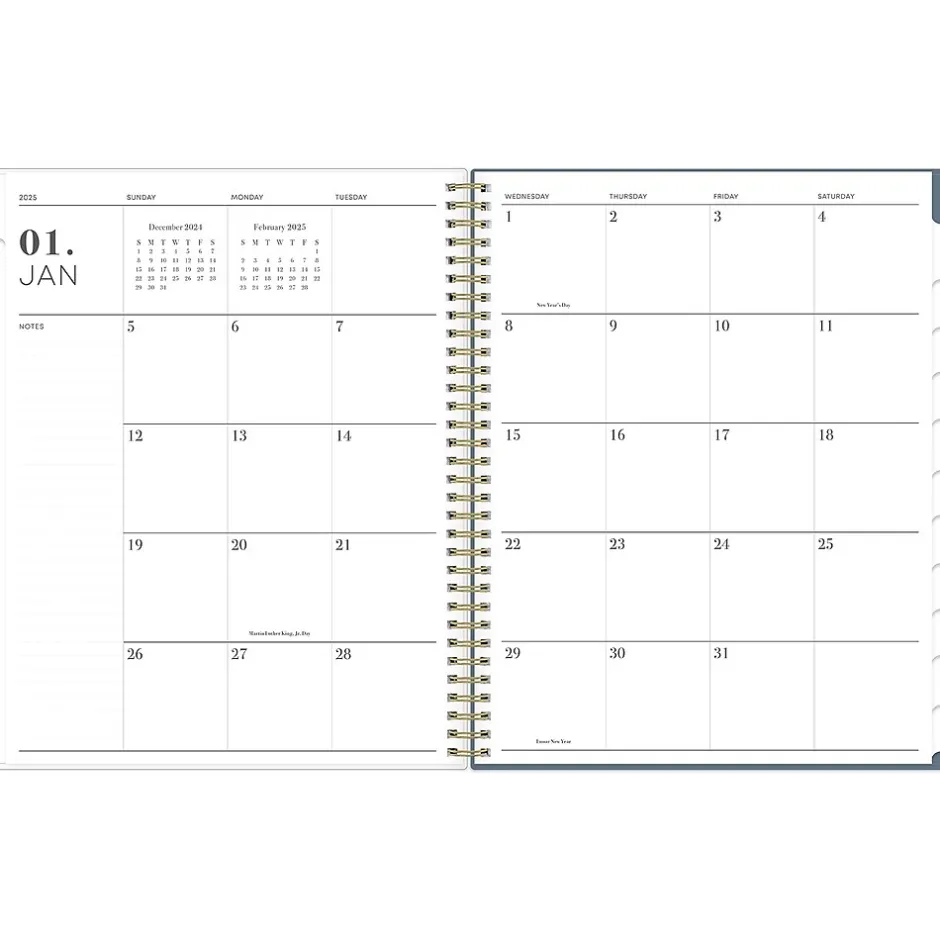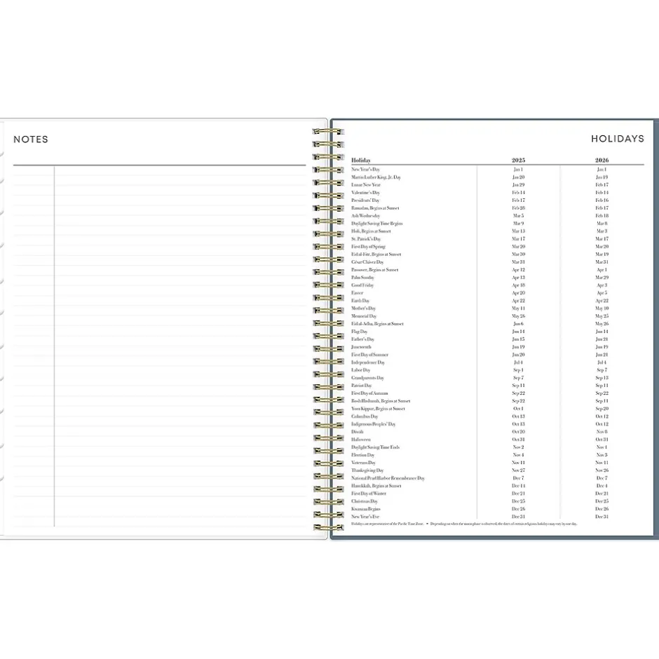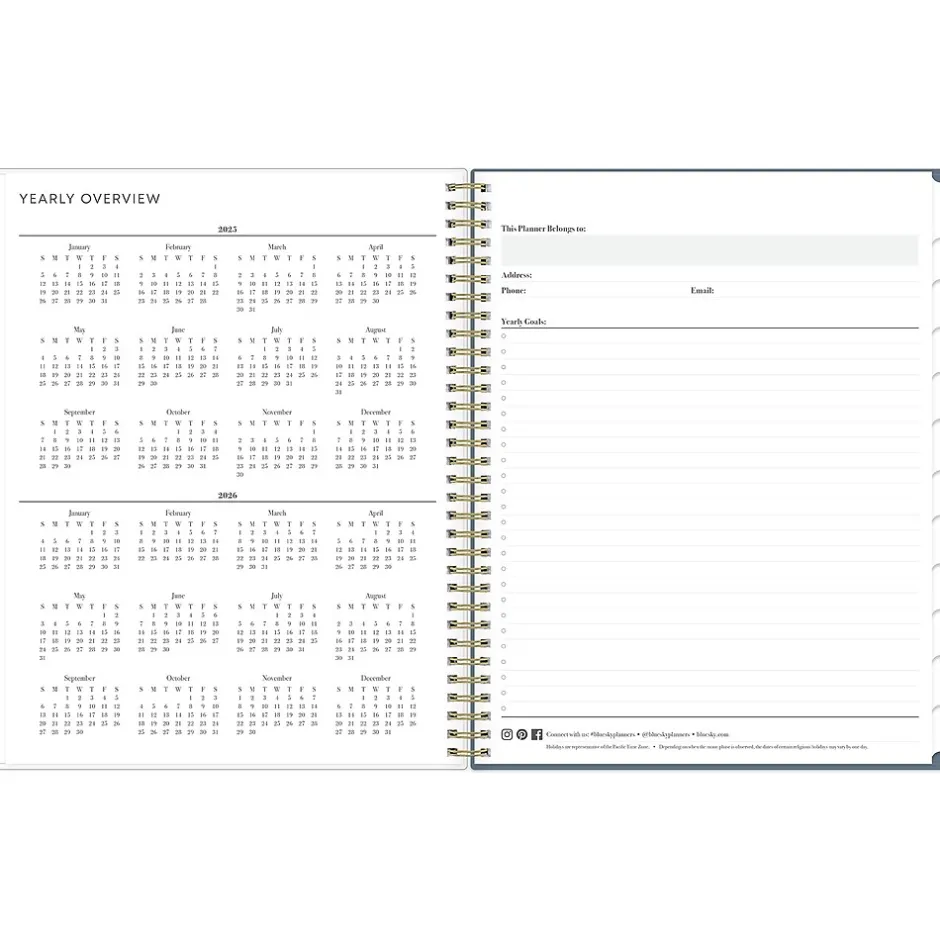 - Yearly overview, list of major holidays, and pages for your contacts, goals, important dates, and notes
