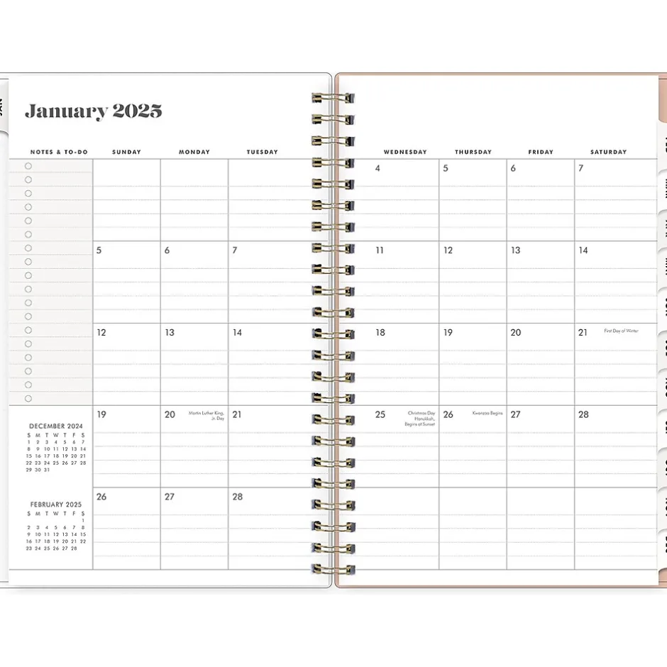 - One month per view, one week per view, notes pages, goal-setting worksheets, two-year calendar, and to-do section checkbox