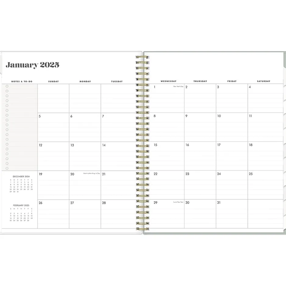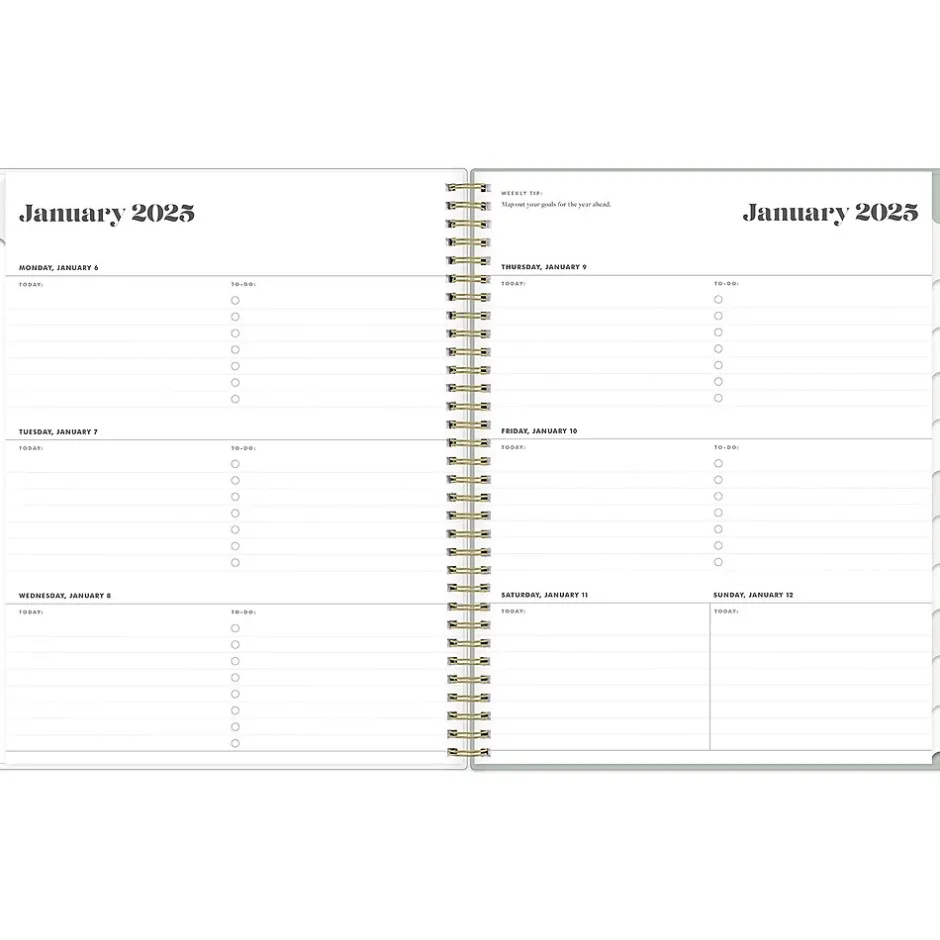 - Weekly and monthly planner covers 12 months from January 2025 to December 2025