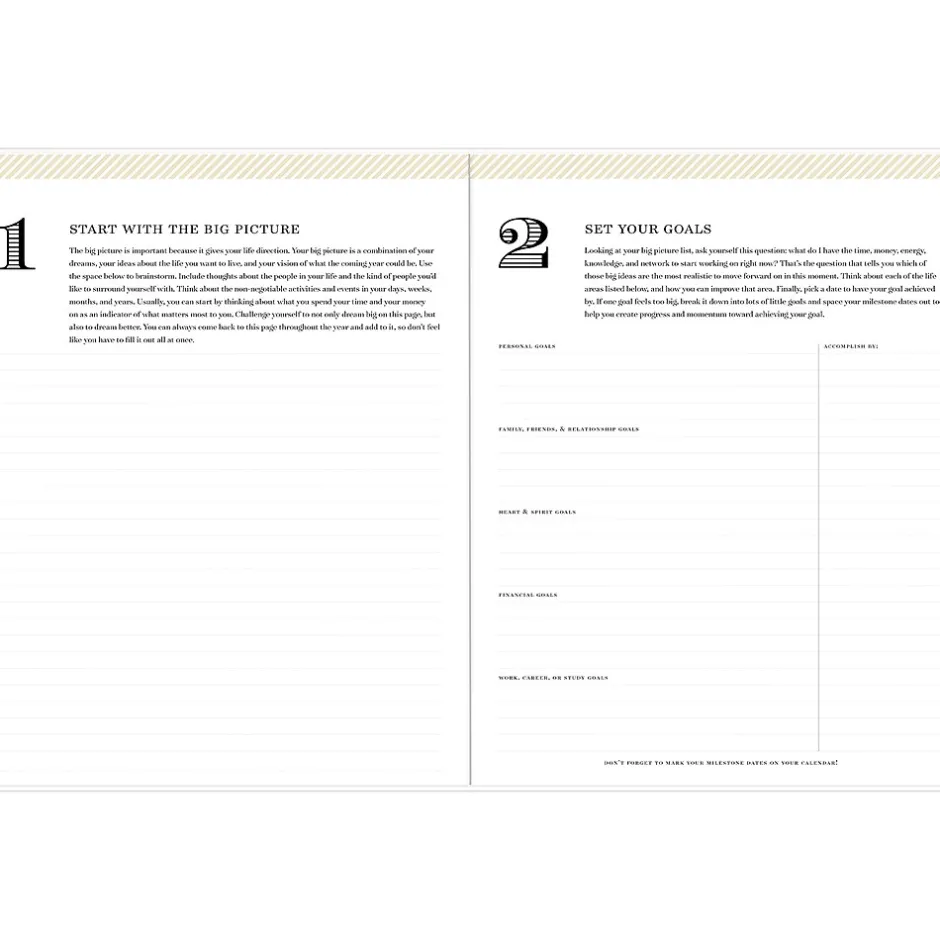 - Yearly overview, list of major holidays, and pages for your contacts, goals, important dates, and notes