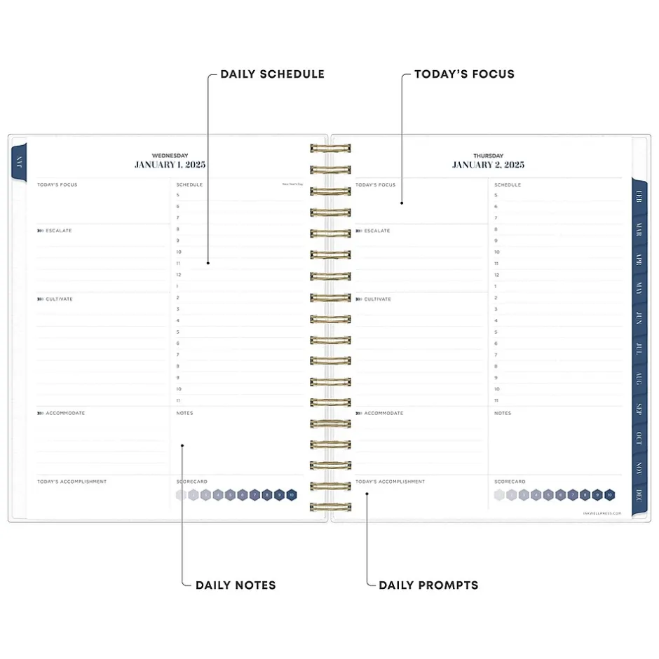 Achieve your goals with inkWELL Press for Blue Sky productivity planners, designed by time management expert Tanya Dalton. This Ombre Sky2025 planner includes the inkWELL Press flexible weekly layouts with tabbed monthly views and notes pages after every month. Use the goal-setting worksheets, monthly mission boards, and habit trackers to track your progress throughout the year. Includes stickers and a paper storage pocket.