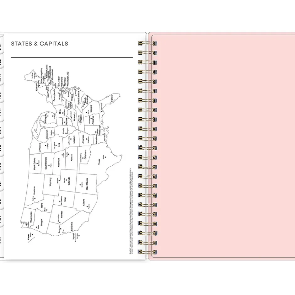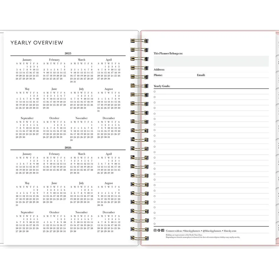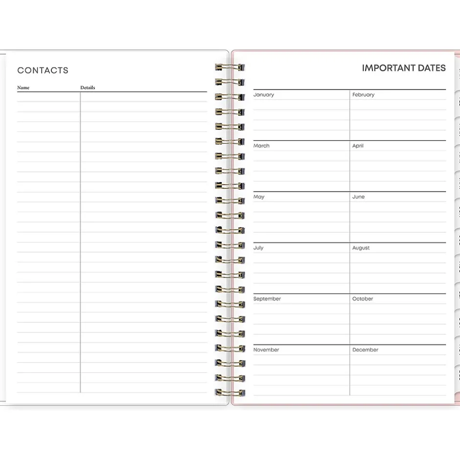 - Yearly overview, list of major holidays, and pages for your contacts, goals, important dates, and notes