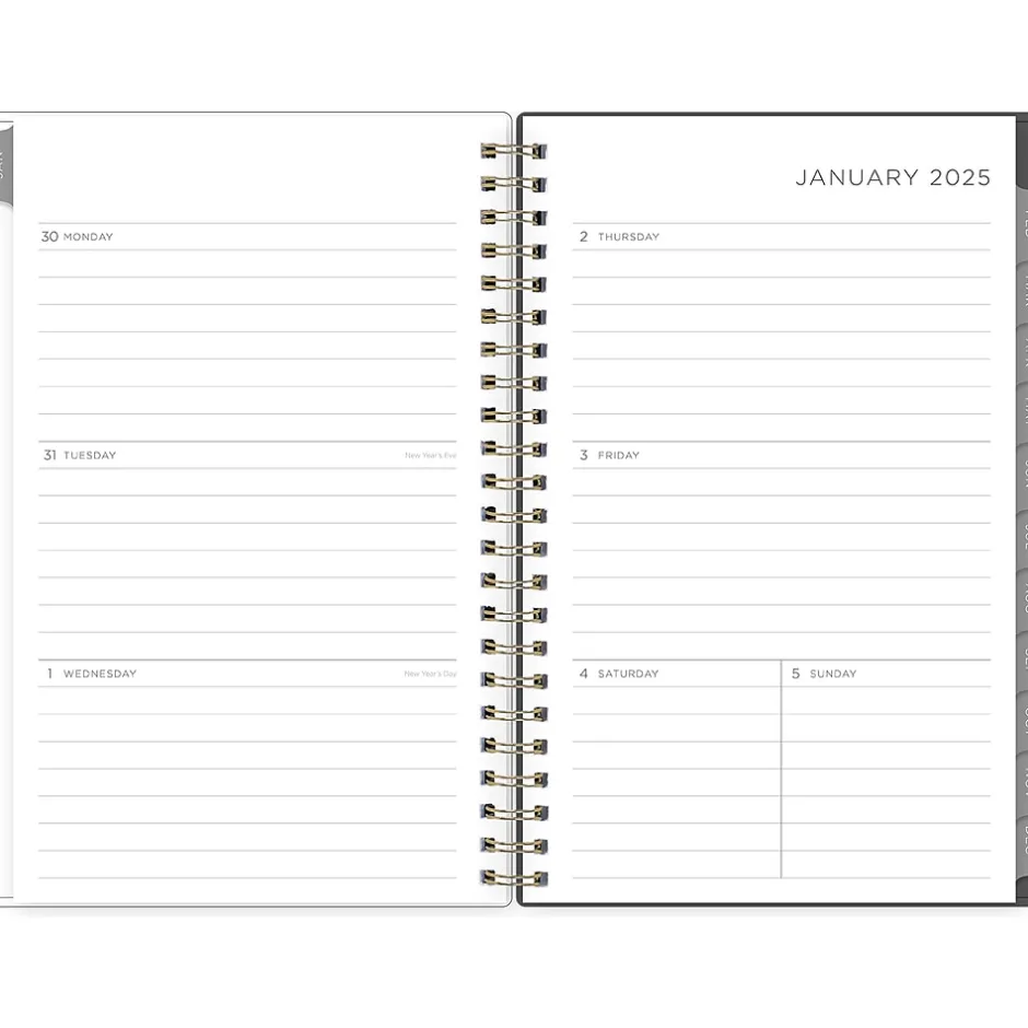 - Offers one month per two pages and one week per two pages with space for notes and quick reference calendars
