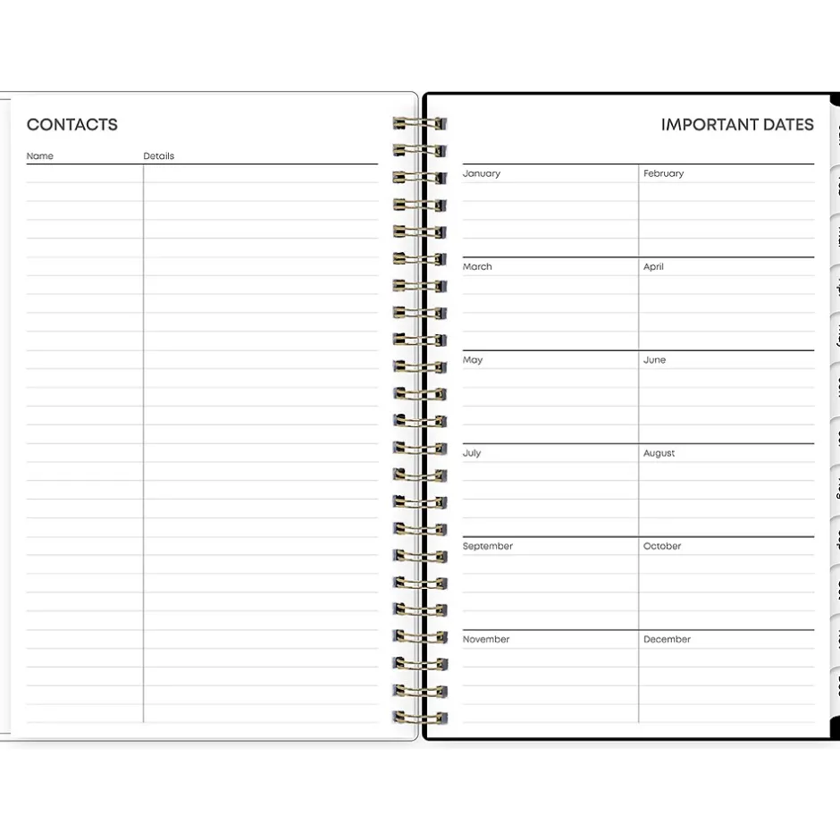 - Yearly overview, list of major holidays, and pages for your contacts, goals, and important dates