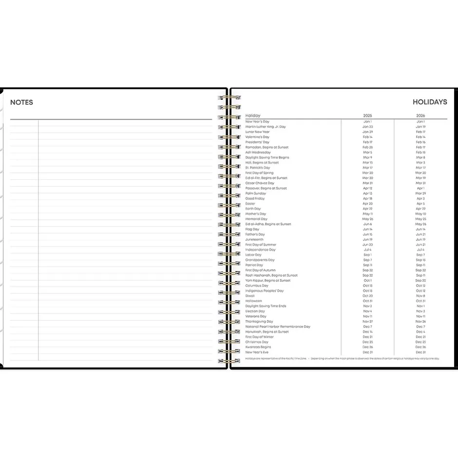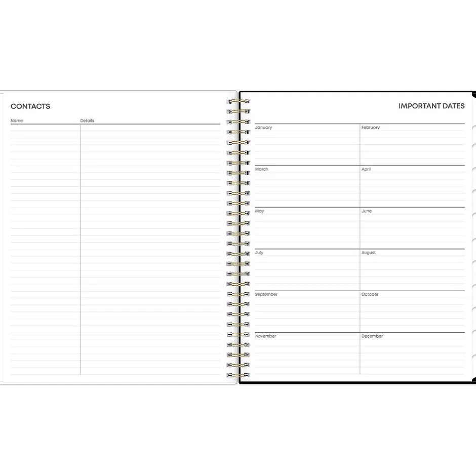 - Yearly overview, list of major holidays, and pages for your contacts, goals, important dates, and notes