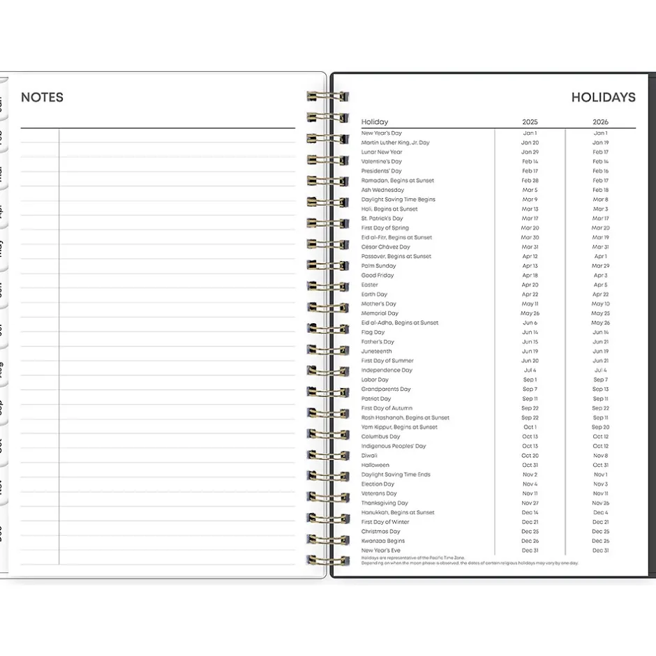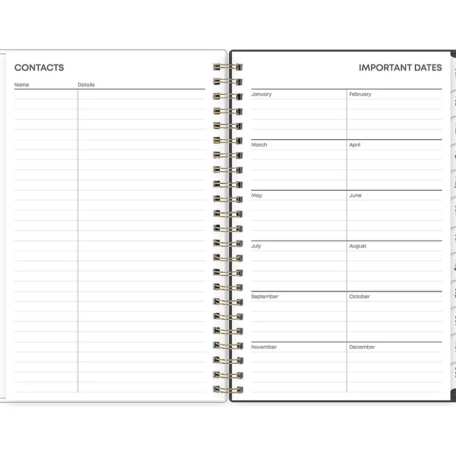 - Offers one week per two pages and one month per two pages, with space for notes and quick reference calendars