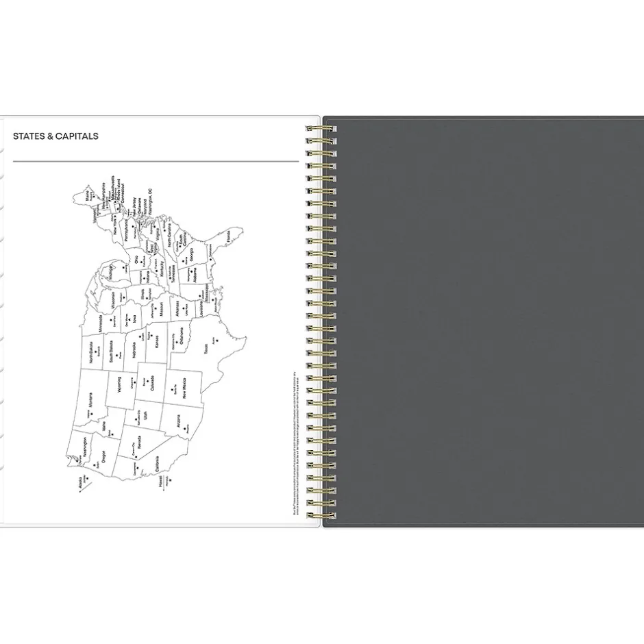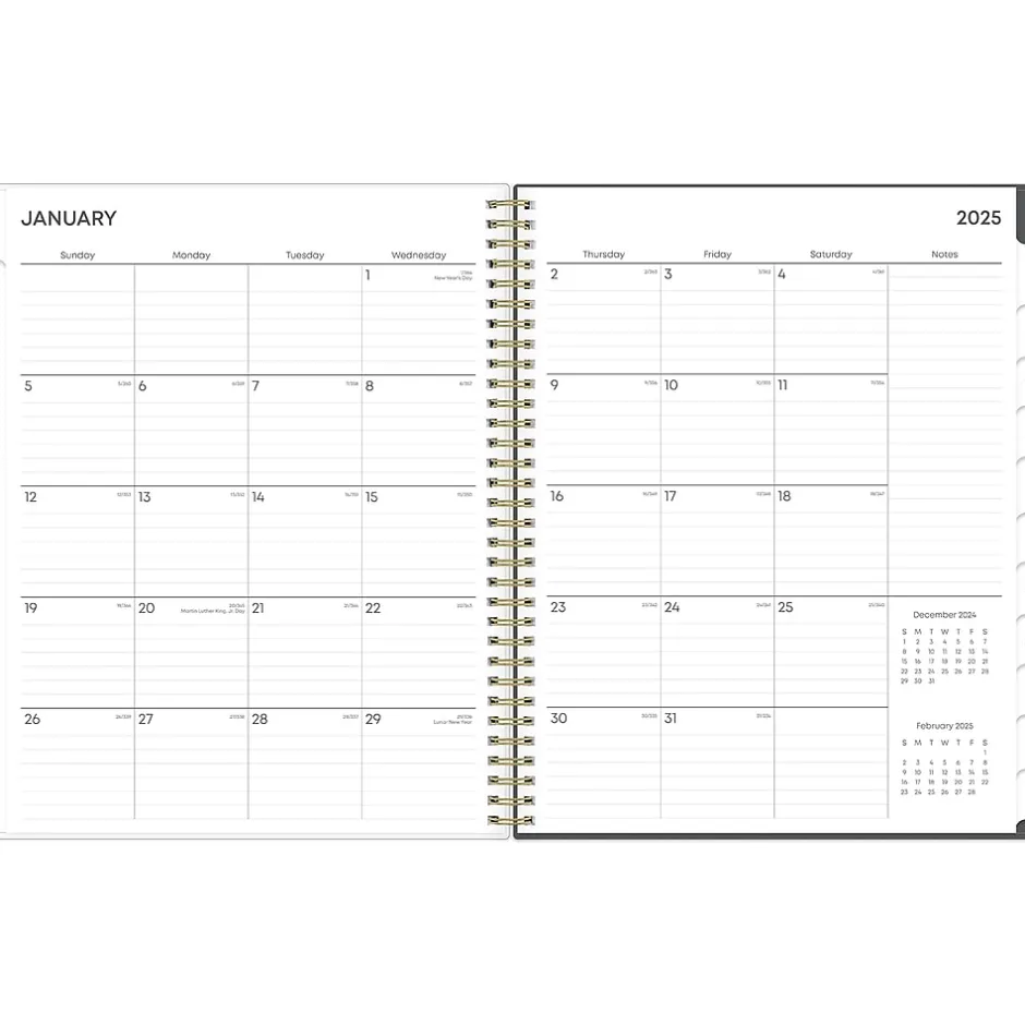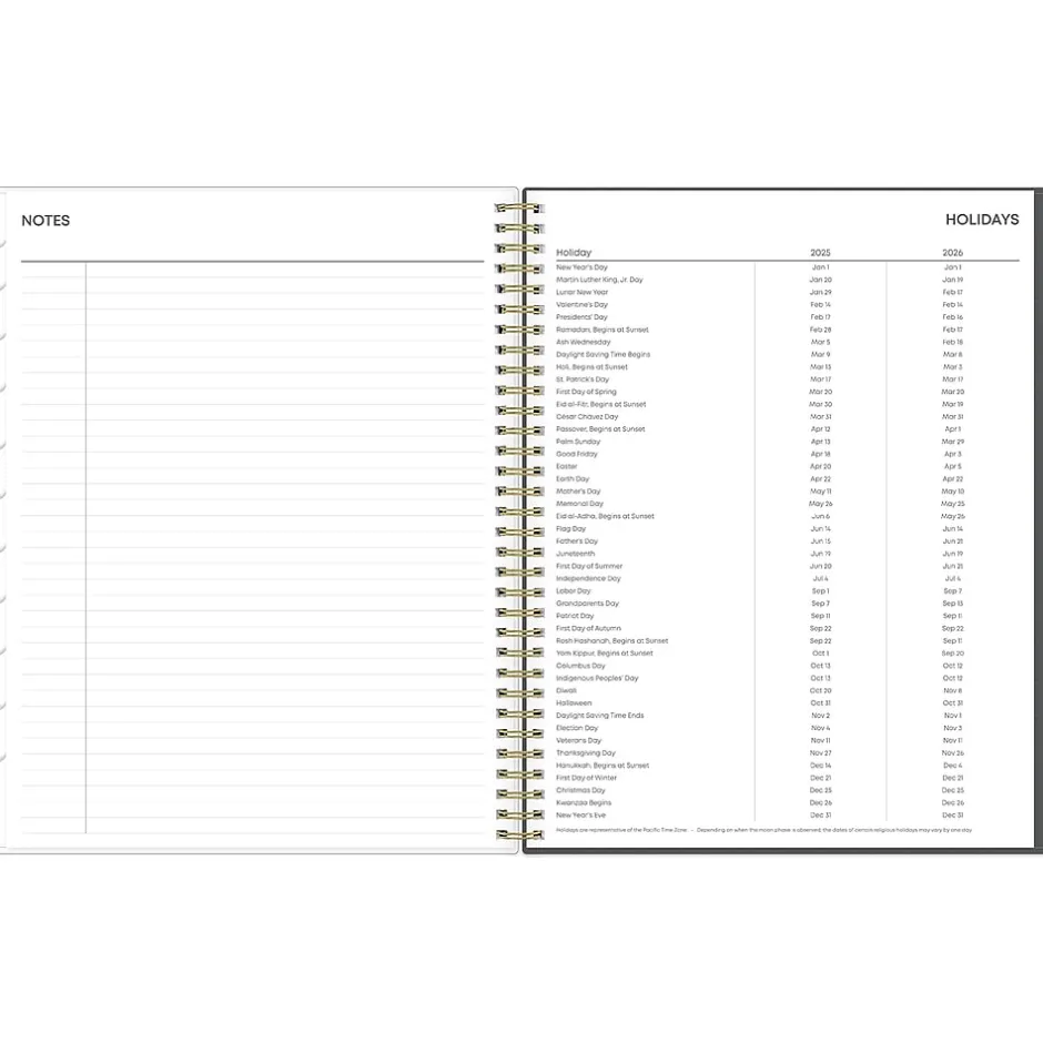 - Features one month per two pages and one week per two pages, with space for notes and quick reference calendars