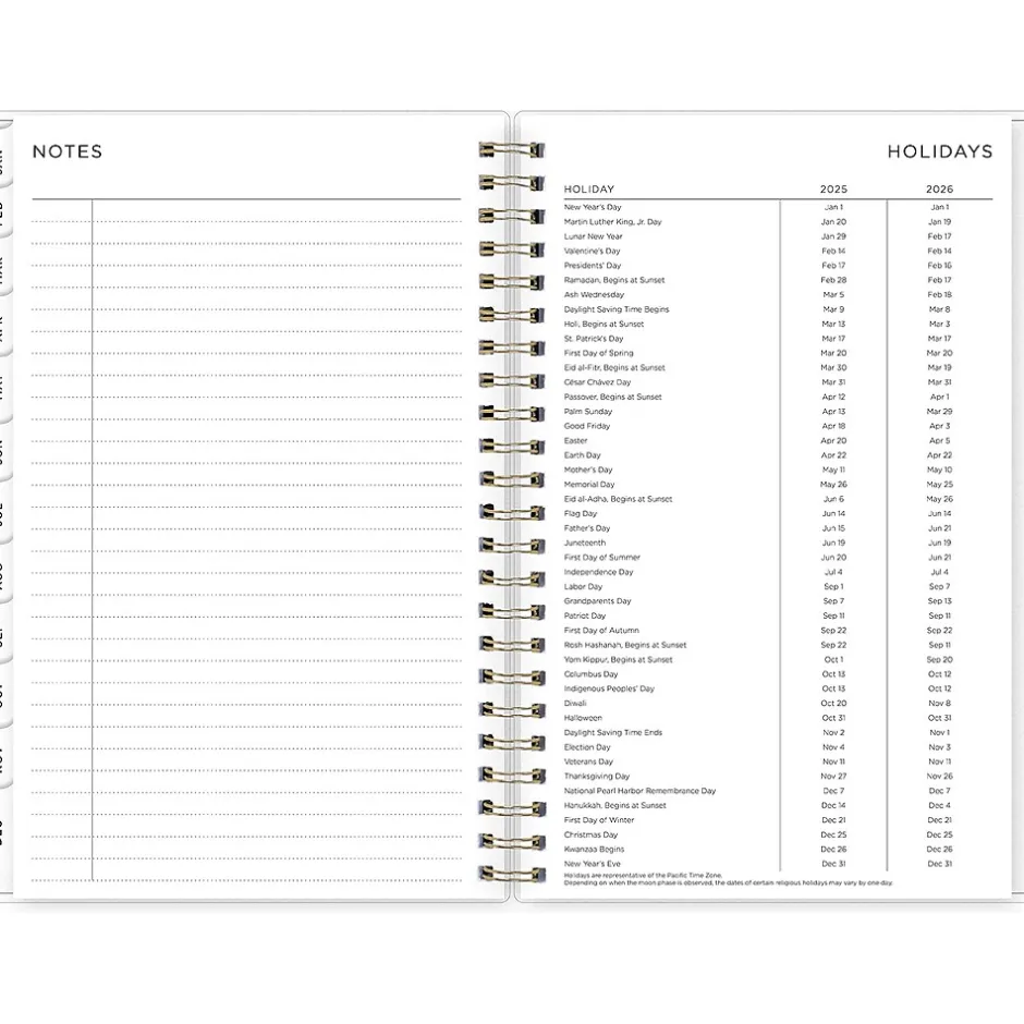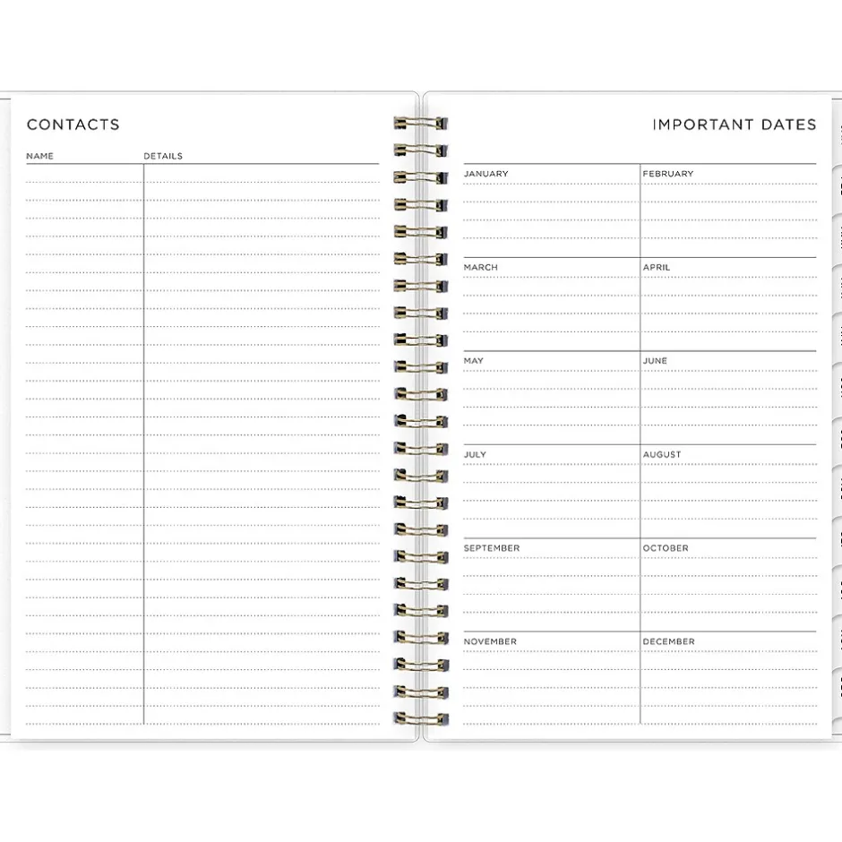 - Yearly overview, list of major holidays, and pages for your contacts, goals, important dates, and notes