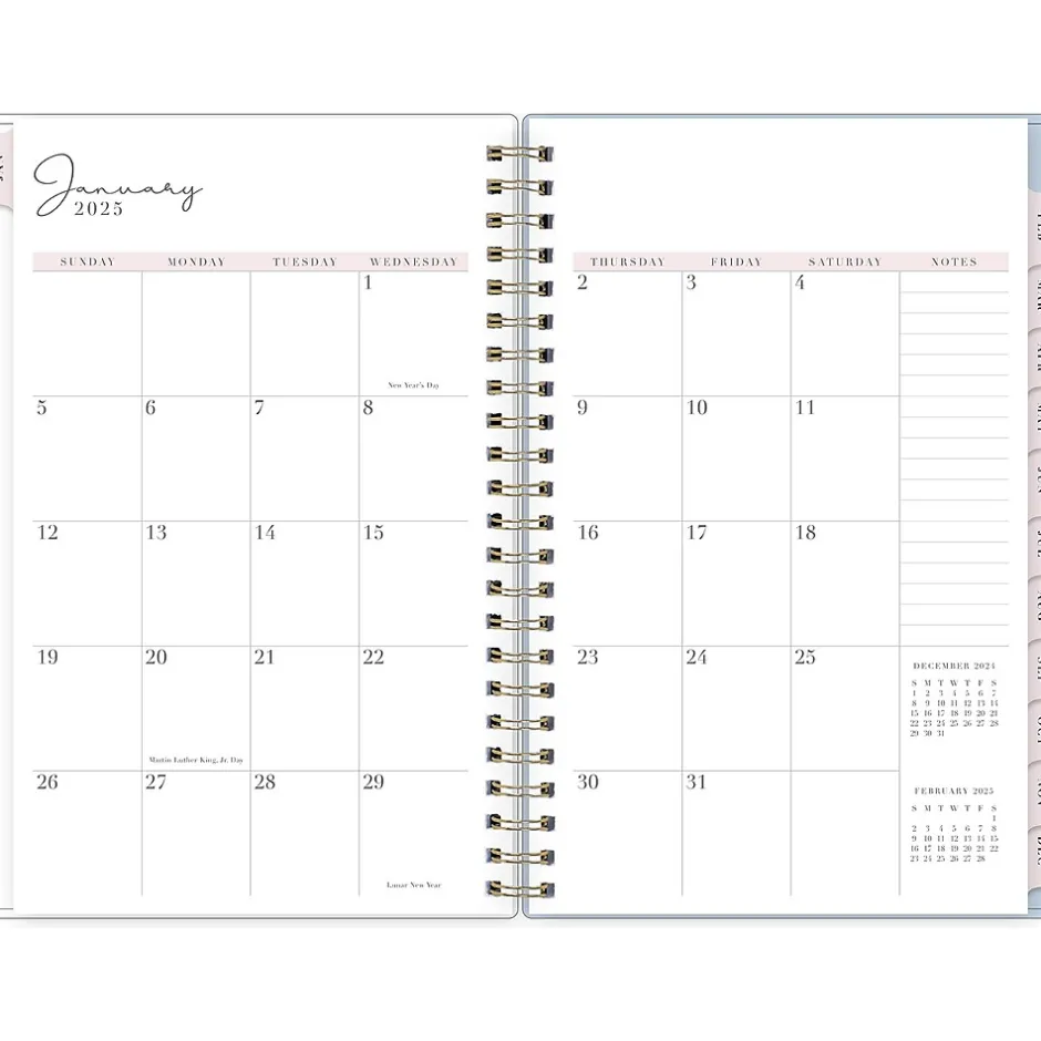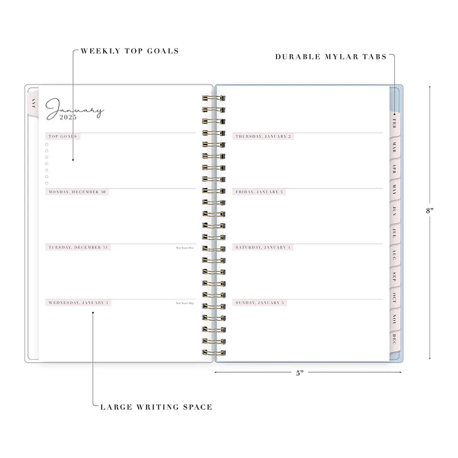 Organize your tasks with the 2025 Parcella planner from Rachel Parcell for Blue Sky. It includes stickers and a storage pocket and features unruled weekly layouts, tabbed monthly views, and notes pages to help you manage your schedule.