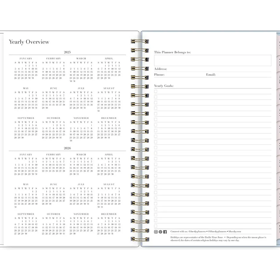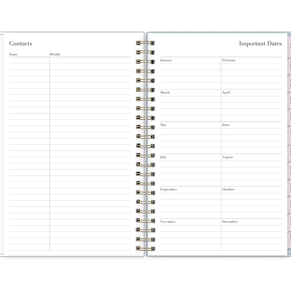 - Yearly overview, list of major holidays, and pages for your contacts, goals, important dates, and notes