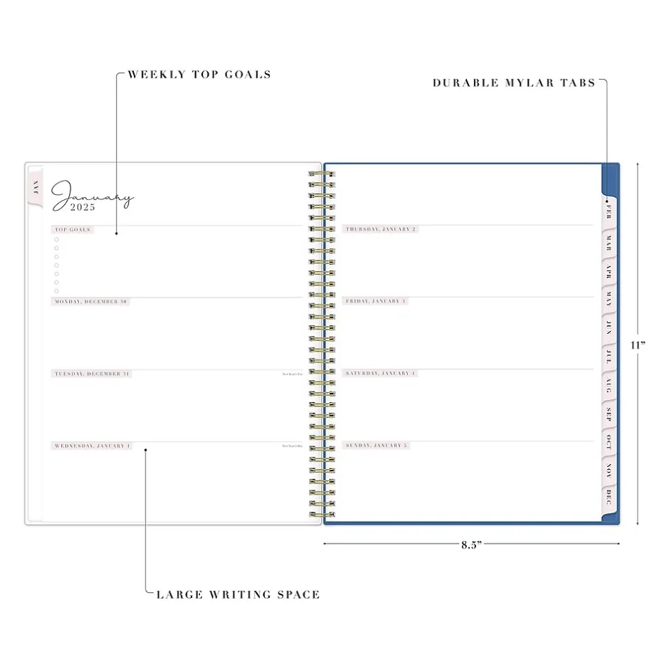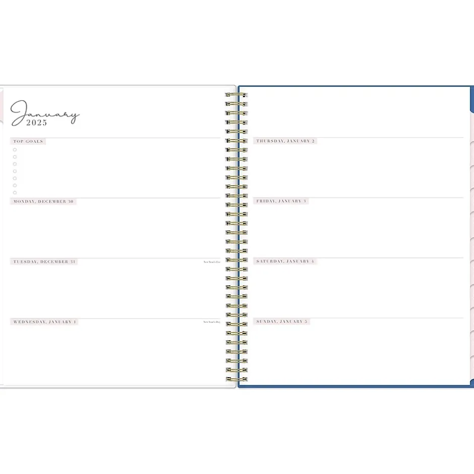 Organize your tasks with the 2025 Tressa planner from Rachel Parcell for Blue Sky. It includes stickers and a storage pocket and features unruled weekly layouts, tabbed monthly views, and notes pages to help you manage your schedule.