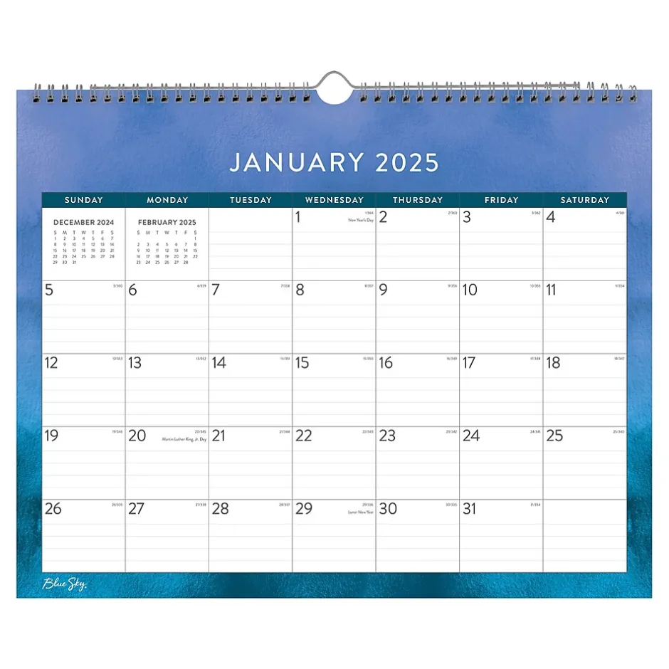 Made for 2025, the Blue Sky Savoy Cool wall calendar accentuates any room. Easy to read with a large font, this calendar is a perfect tool to track deadlines and birthdays. Enjoy high-quality white paper, large text, and hassle-free hanging with a sturdy hook.