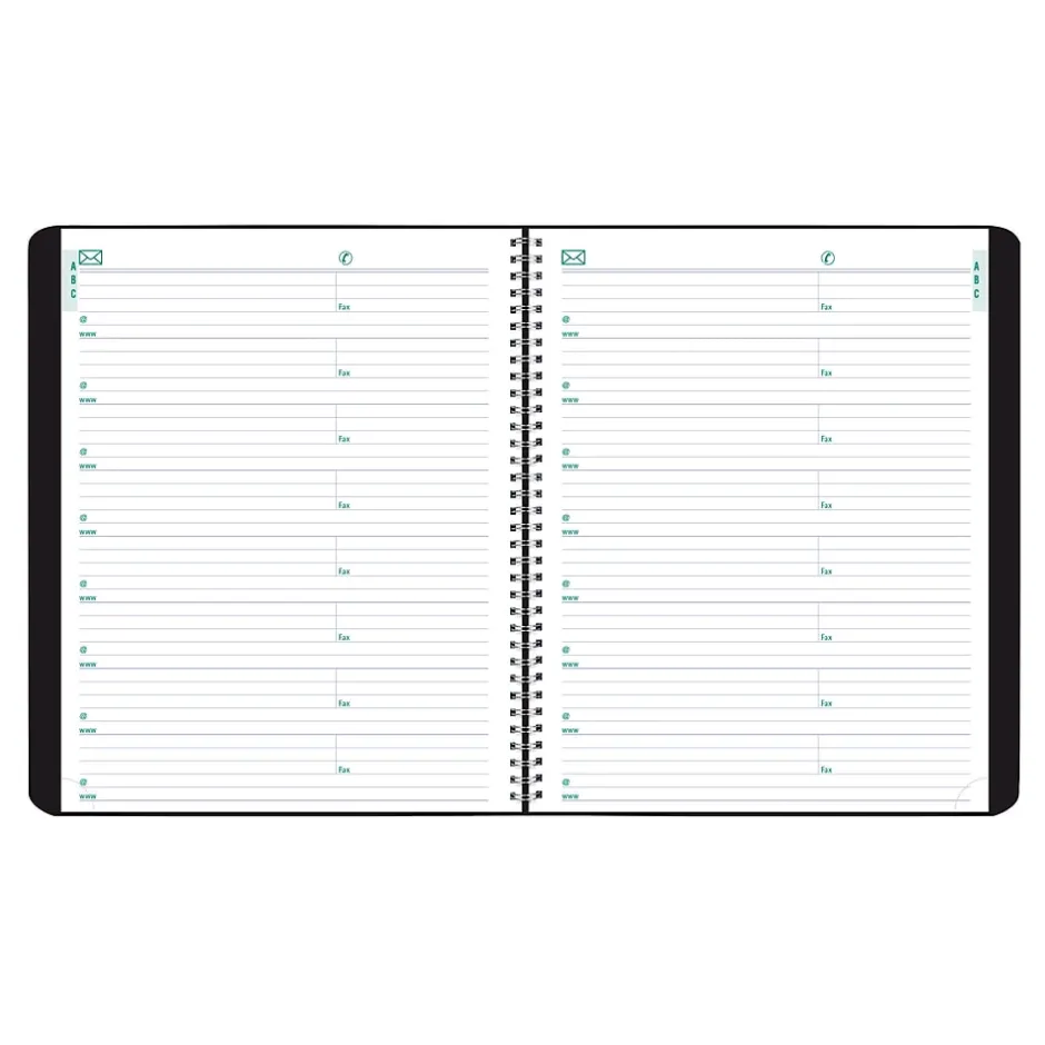 - Features a month to view format, with one ruled block per day; contains reference calendars of past, current, and following months on each spread, as well as a contacts with telephone and address section