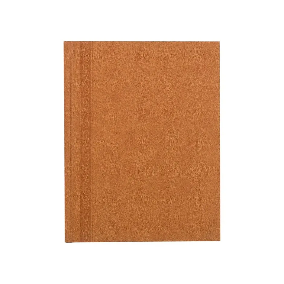 - Perfect binding with hard tan, nubuck-like cover