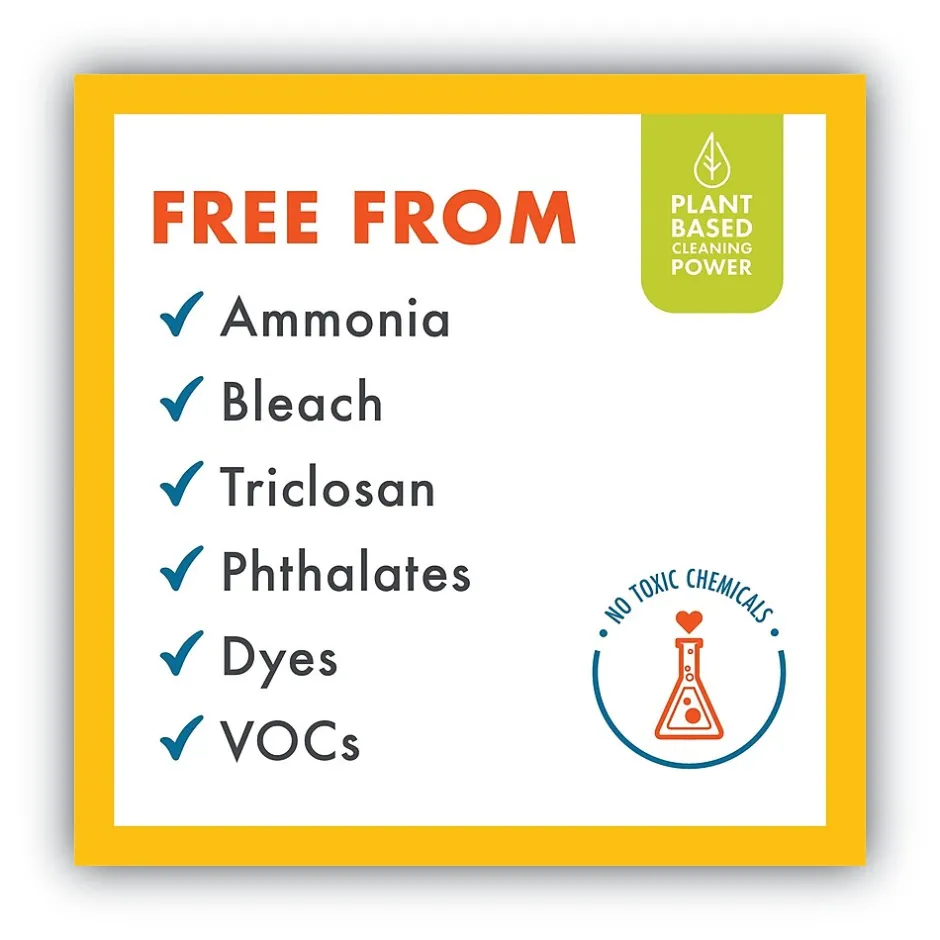 Multitasking at its best! This disinfectant cleans, deodorizes and disinfects in one easy step. No need to rinse, even on food contact surfaces and children’s toys. Ready-to-use formula requires no mixing. The active ingredient Thymol kills cold and flu viruses on hard, non-porous surfaces and eliminates 99.9% of household germs and allergens. It dries streak-free and leaves no residue. Free from harsh chemicals, this plant-powered lemon scented formula is safe to use around kids and pets.