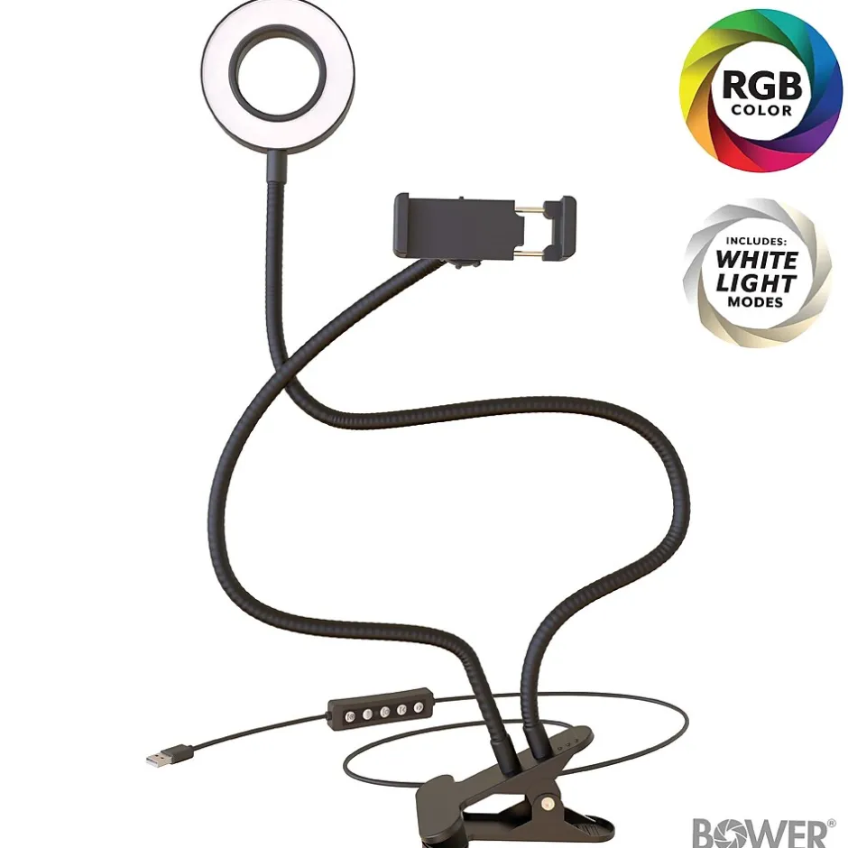 Make videos at night or take great selfies in dark areas with this Bower 24 In. Flexible White and RGB Ring Light. It’s ideal for creating live videos with a smartphone or the computer, and for vlogging, video chats, social media, live streaming, and more! The 24 in. flexible arm is designed to fit most phones and can be positioned into any shape. The 360° rotating lazy bracket clip can adjust to any angle and opens up to 3.6 in. to fit most phones.