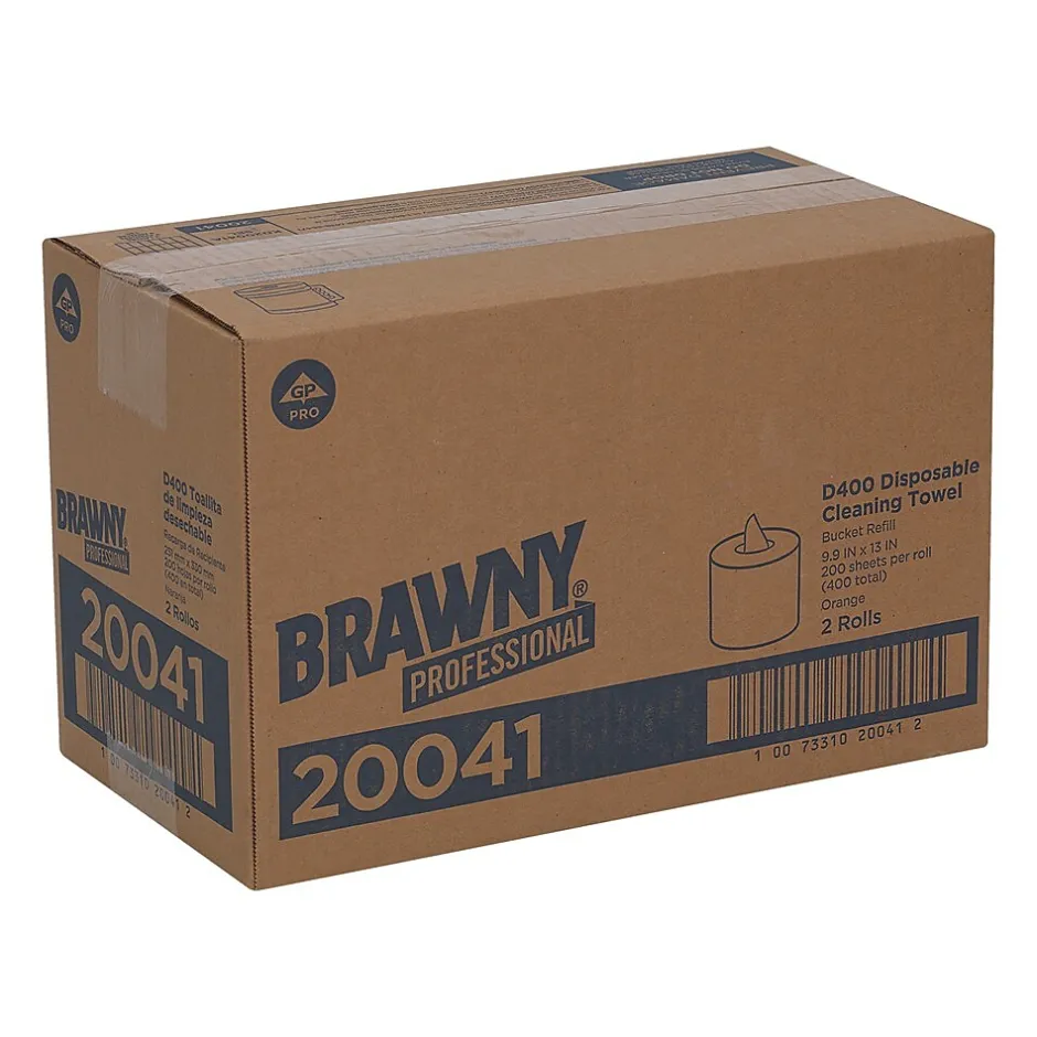 GP Brawny Professional disposable cleaning towels mop up all types of messes with a sturdy design that allows for fast moisture absorption. Ideal for absorbing water, grease and oil, these towels come in orange for a heavy-duty look. Each sheet features a large size for more cleaning range, reducing the need to use multiple sheets. Constructed of durable fibers, these towels offer bulk and strength to handle nearly any mess. With two rolls per case, you can refill more than one bucket.