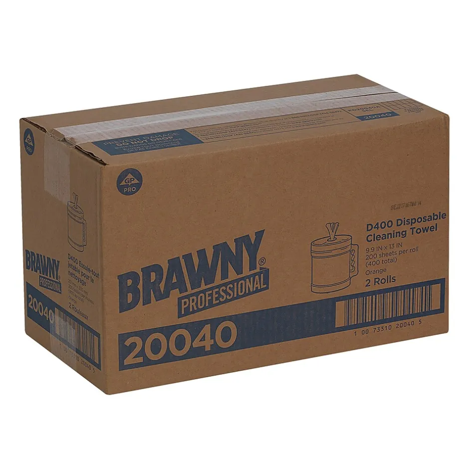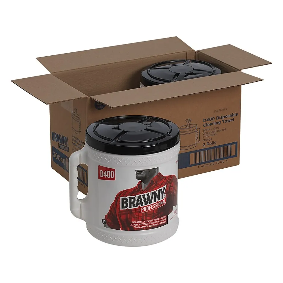 Brawny® Industrial wiper in orange color comes in a tub with pop-top lid, an ergonomic handle to hold wipers clean and dry. Wiper absorbs water and oil on contact, sold as 200 per tub.