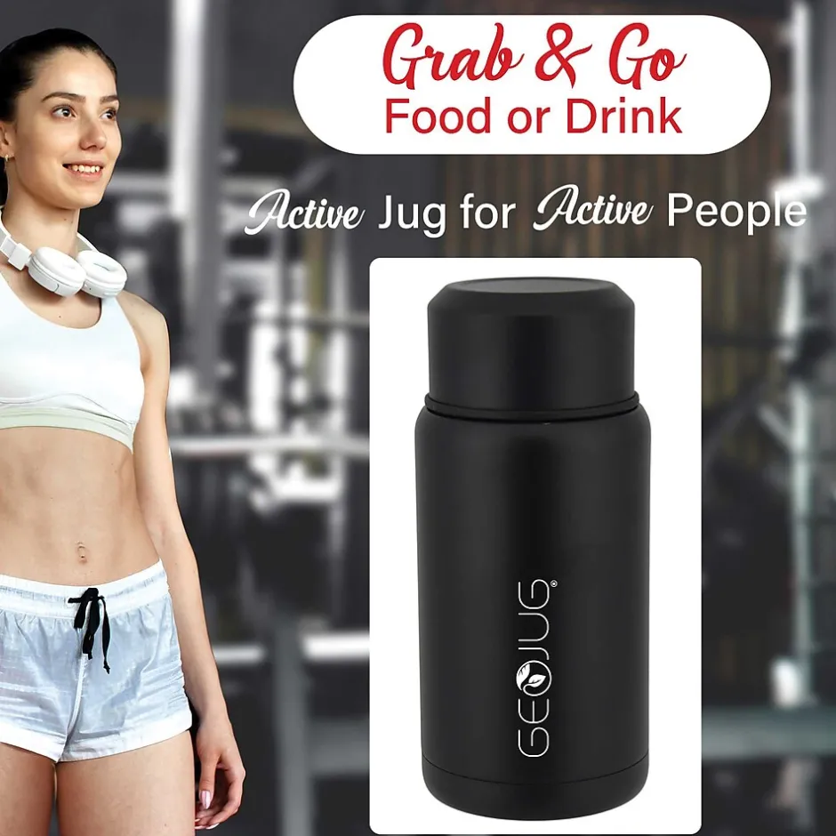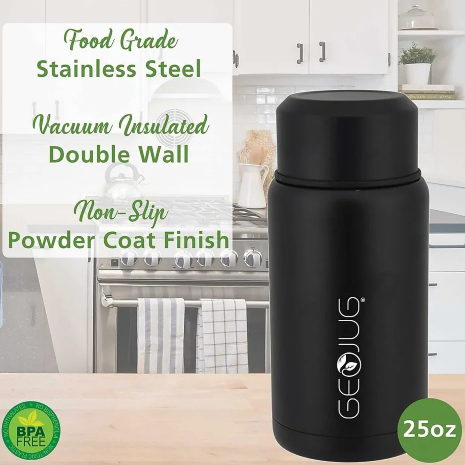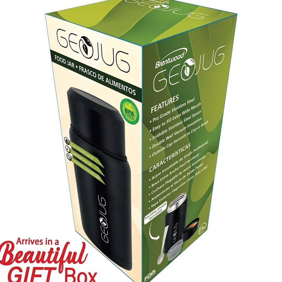 Use the Brentwood® Geojug 25-Oz. Vacuum Insulated Stainless Steel Food Jar with Bowl and Folding Spoon to keep food or drinks hot or cold for hours. Always enjoy the pure taste of your food and drink thanks to tasteless and odorless pro-grade stainless steel construction. The jug features a wide mouth for quick filling and easy cleaning. Serve yourself a bowl of food or soup or share drinks with friends. The outer screw on lid can be flipped over and used as a bowl or cup. The included folding stainless steel spoon stores inside the interior lid. Double-wall vacuum insulation ensures the food jar never sweats. The food jar has a jet black finish for a modern aesthetic.