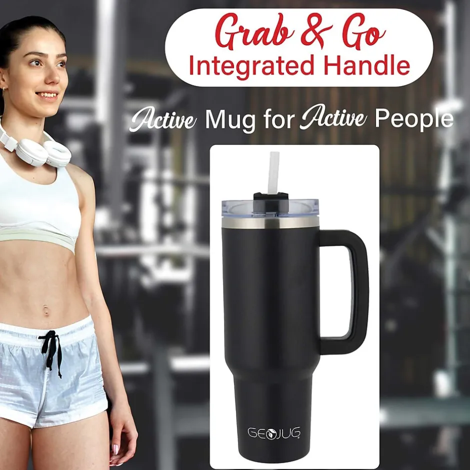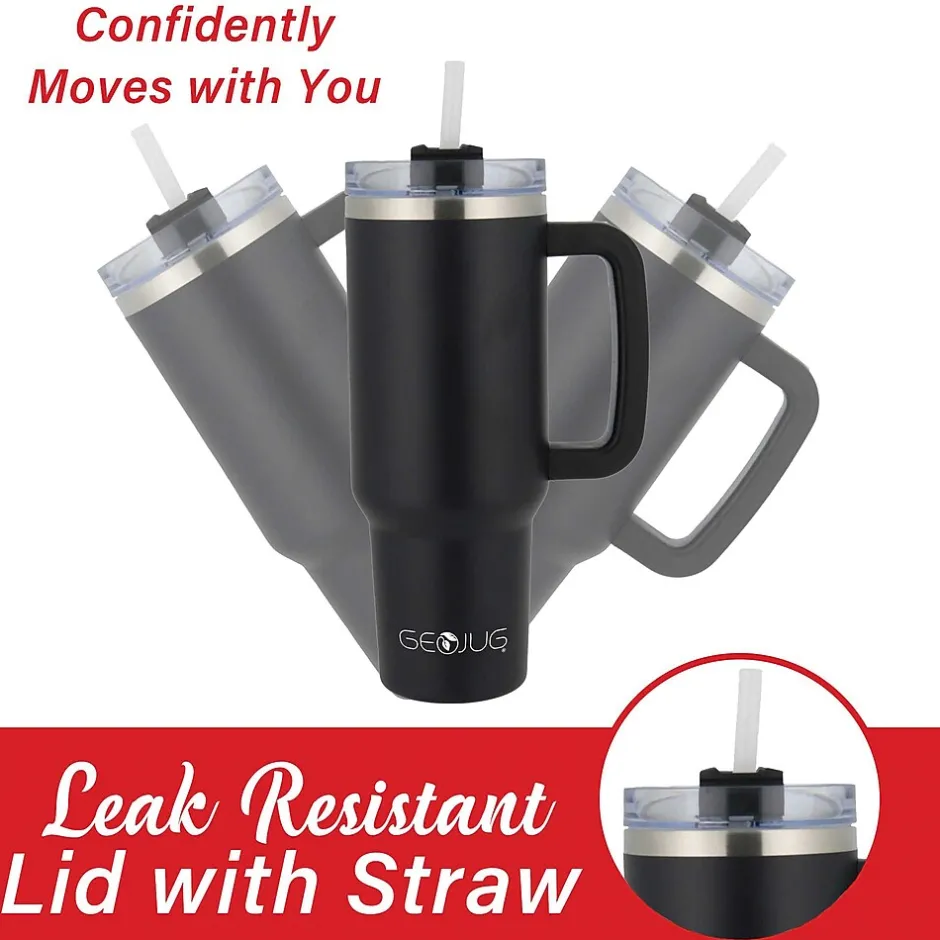 The Brentwood® Geojug 40-Oz. Insulated Stainless Steel Tumbler Cup with Handle, Lid, and Straw quenches your thirst on the go. Conveniently take your favorite drinks anywhere and everywhere with the integrated comfort handle. The leak-resistant lid keeps spills away while the straw provides endless sipping comfort. The smartly designed travel mug fits in all kinds of cup-holders so you’re always in arms-reach of your drink. Stainless steel double-wall vacuum insulation keeps your beverages super hot or ice cold for hours and never sweats. Tasteless and odorless, pro-grade stainless steel is highly durable and super-easy to clean.