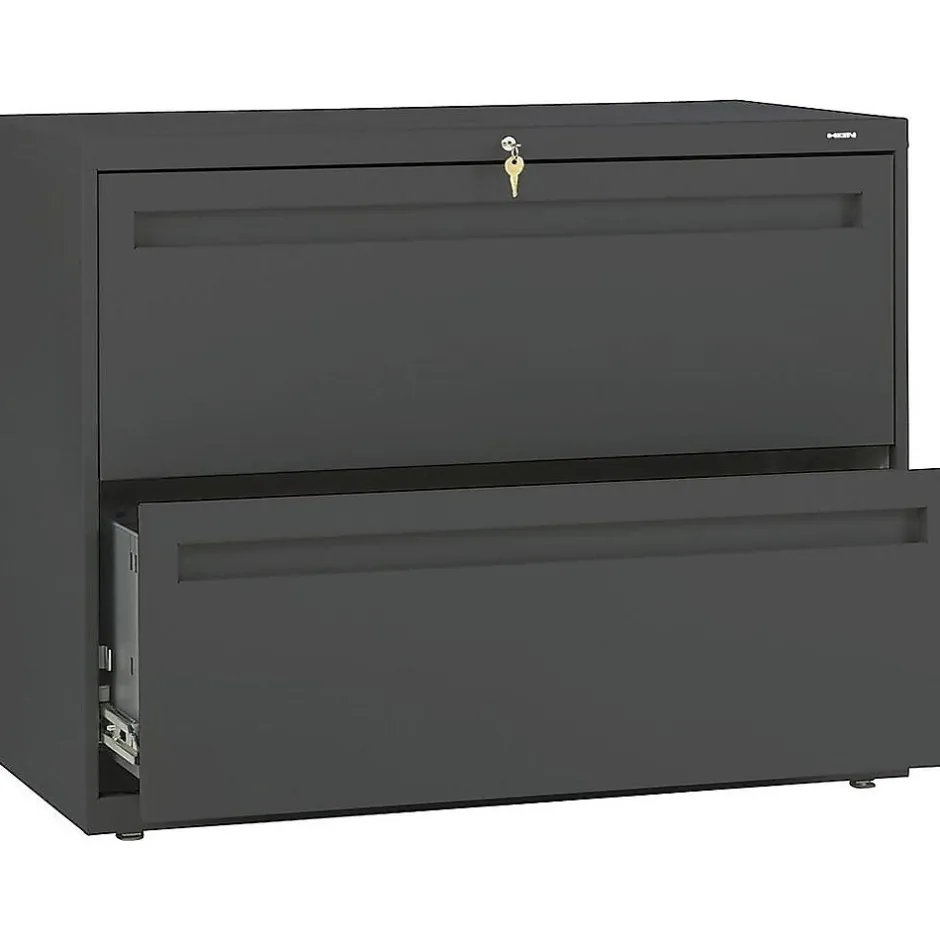 Keep your work space organized with this two-drawer lateral filing cabinet. It has a counterweight and mechanical interlock that keeps only one drawer open at a time for added stability, and leveling glides allow for proper placement on uneven floors. Secure both drawers of this 36-inch HON Brigade lateral file cabinet with the built-in lock.