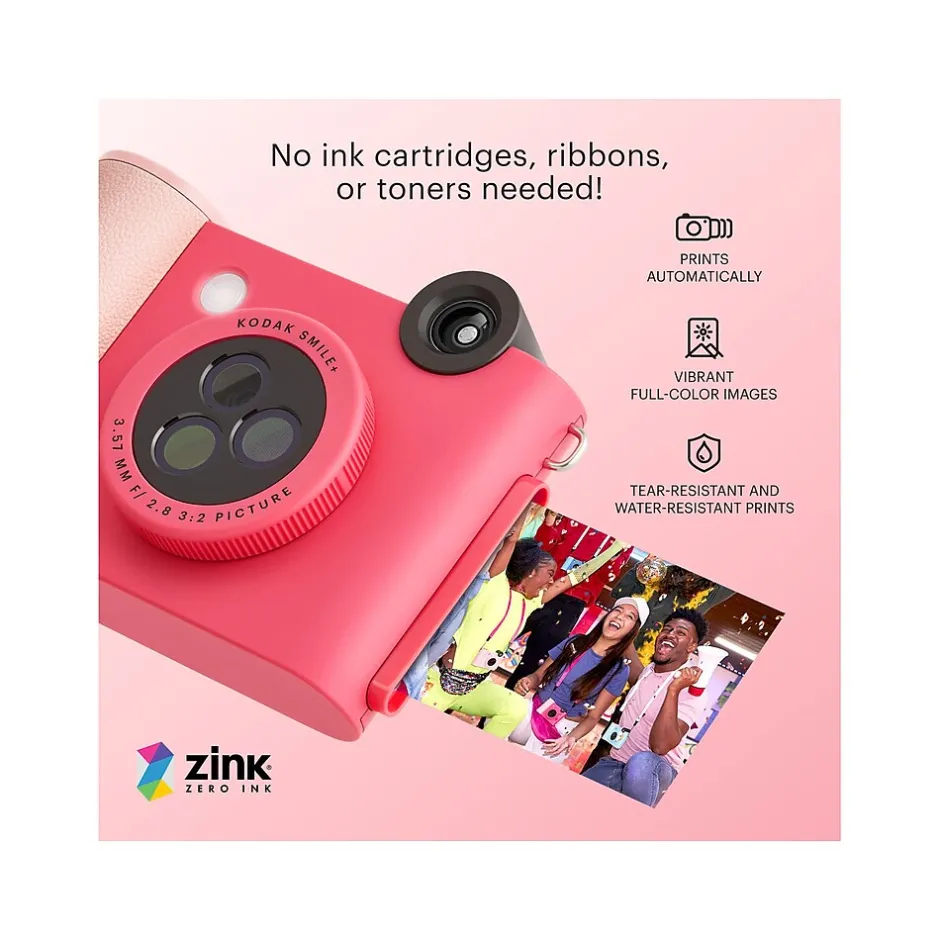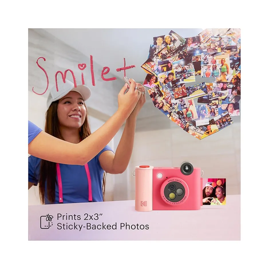 Make taking photos fun again with the Kodak Smile+ digital instant print camera. With this easy-to-use, enjoyable device, the smiles will never disappear. Take this rechargeable camera with you anywhere you go so you can take memory photos at the park, on vacation, during parties, on a road trip, and so on. And with the integrated filter-changing lens, taking new pictures never gets old. Add new spice and thrills to the photos you take by switching to a new filter in a second. With this fun-having camera, pictures stand out more than ever before. And since this camera is compatible with ZINK photo paper, you don’t need to worry about buying ink. Take a photo and watch your wonderful image print out on ink-free, sticky-backed paper. The Smile+ gives you a reason to put a smile on.