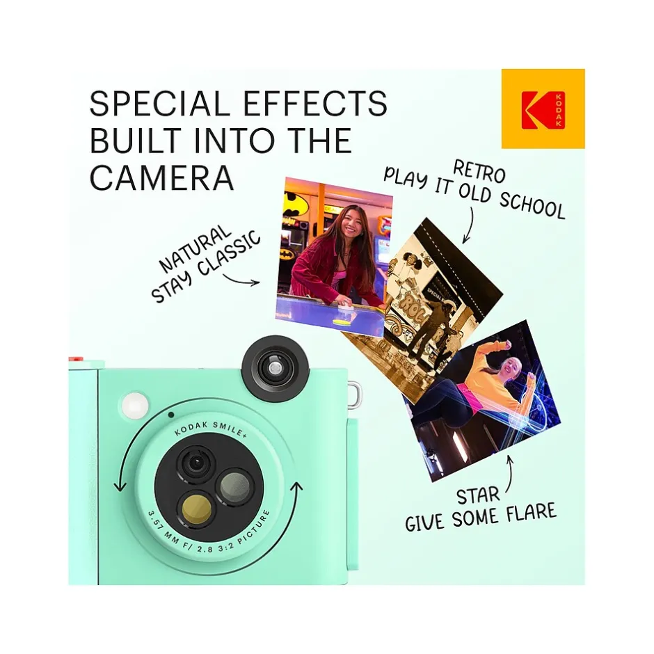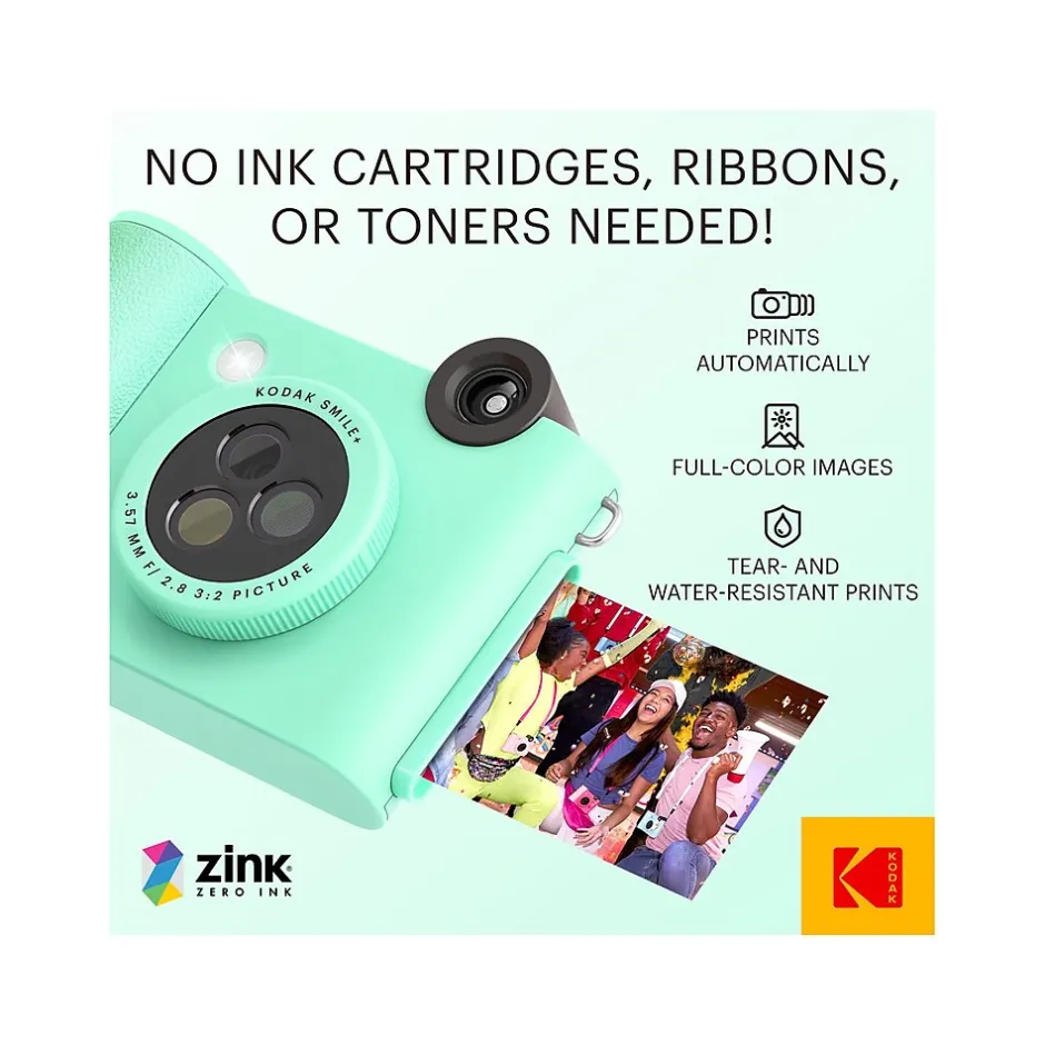 Make taking photos fun again with the Kodak Smile+ digital instant print camera. With this easy-to-use, enjoyable device, the smiles will never disappear. Take this rechargeable camera with you anywhere you go so you can take memory photos at the park, on vacation, during parties, on a road trip, and so on. And with the integrated filter-changing lens, taking new pictures never gets old. Add new spice and thrills to the photos you take by switching to a new filter in a second. With this fun-having camera, pictures stand out more than ever before. And since this camera is compatible with ZINK photo paper, you don’t need to worry about buying ink. Take a photo and watch your wonderful image print out on ink-free, sticky-backed paper. The Smile+ gives you a reason to put a smile on.