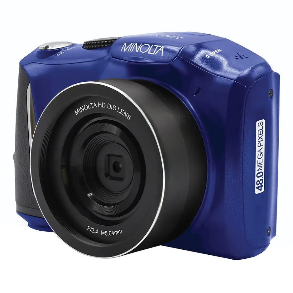The Blue MND50 from Minolta is a robust digital camera with high-end features packed into a point-and-shoot package. Capture 48 MP photos and 4K Ultra HD video with ease using the 16x digital zoom lens and 3-in. IPS LCD monitor. Rotate the mode dial to enable the ideal settings for any scene and shoot closeups in vivid detail and clear focus using the macro mode with ISO 6400.