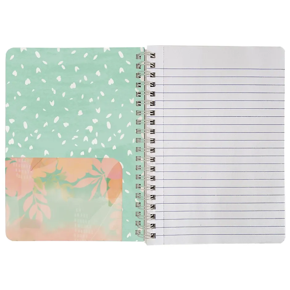 The Silver Lining Personal book is 5″ x 7″ with 80 college ruled sheets & is the perfect size to keep handy for any note taking. Both fashionable and functional, the Silver Lining Personal book features sturdy board covers with silver foil front cover accents. The inside front cover has a pocket for holding small notes, business cards and receipts. Designs can include: popular variations of blue and purple color combinations, Lavender and light orange painterly watercolor designs, Coral background with floral designs and inspirational messages. As an added surprise, in addition to the front and back covers being designed, the inside front and inside back covers are as well! The design is chosen at random, no requests can be made. Includes 80 college ruled sheets which are perforated for easy removal from the silver twin wire binding