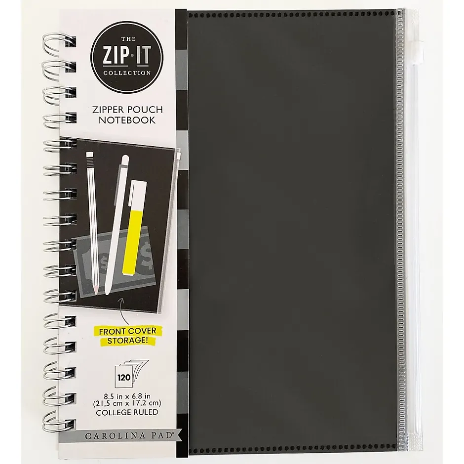 The Carolina Pad Zip-It notebook features a slide zipper front pocket cover. Perfect for storing small notes, business cards, USB drives, etc. The notebook measures 8.75” x 7”, making it the perfect size for school and work. There are 120 college-ruled perforated sheets and two interior dividers. The front cover is durable poly and the back is heavy-duty board. The binding consists of twin nylon-coated wire.
