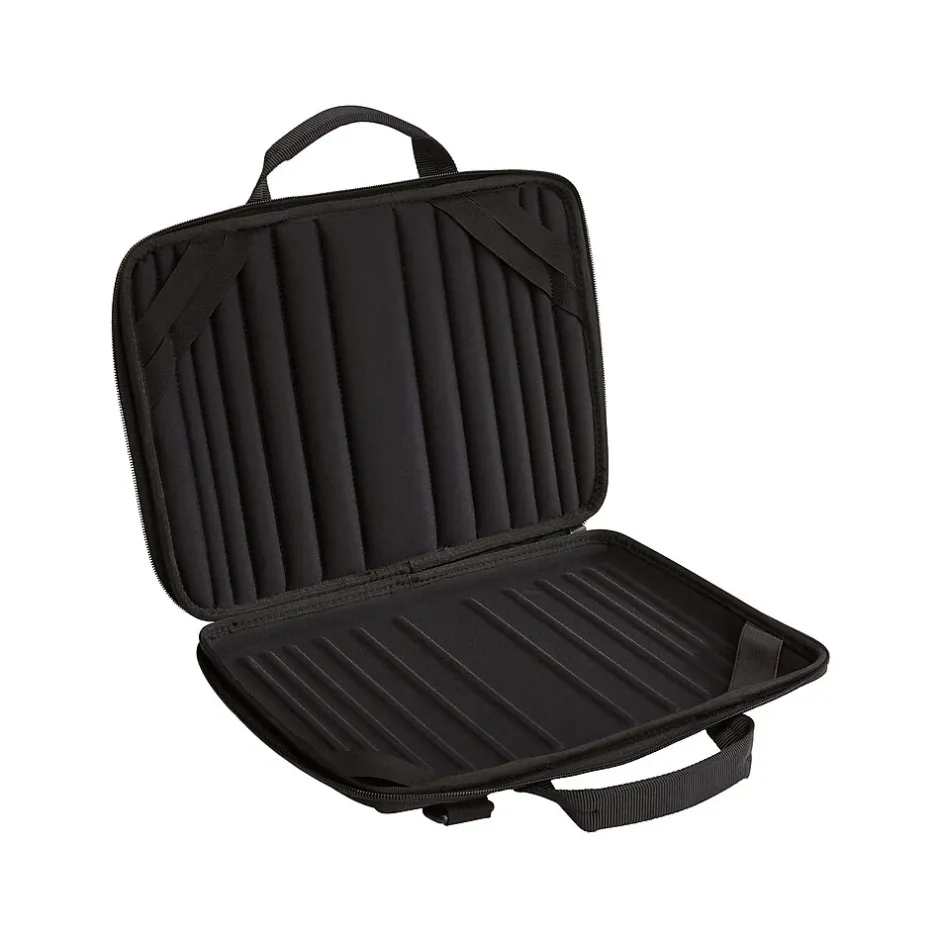 The Case Logic hardshell laptop work-in case features protective thick padding, molded ridges for airflow, and accessory storage. The slim molded EVA work-in case fits Chromebooks with screens up to 11.6″. Padded handles and removable padded shoulder strap provide multiple carry options. An accessory pocket stores cords and other small daily items. Thick, quilted padding keeps the device protected and securely in place. Clamshell design and molded airflow channels allow for in-case use. Elastic corner loops keep most 11.6″ Chromebooks/laptops anchored in place. Features a clear ID slot on the exterior for easy identification.