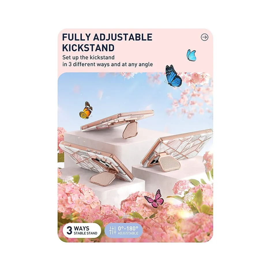 The i-Blason Cosmo Cute Marble Pink case ensures a 360-degree protection against bumps and falls for your Samsung Galaxy S24 Ultra (2024). The case features a dual-layer hybrid back cover made of dual-layer TPU. Set up the kickstand in three different ways at any angle. Camera protection tested to withstand more than 30000 uses.