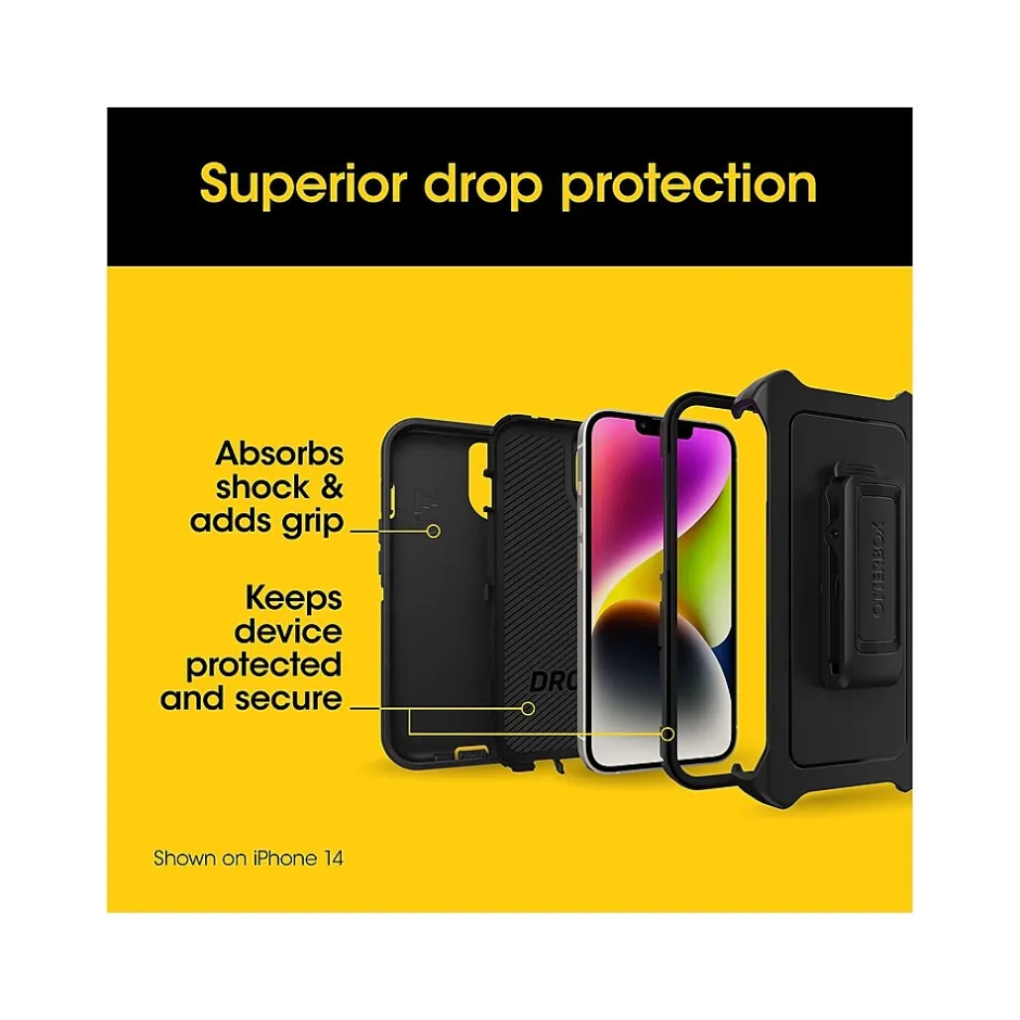 Legendary durable iPhone 15, iPhone 14, and iPhone 13 case, OtterBox Defender Series, with a multi-layer construction guards your device from serious drops, dirt, scrapes, and bumps. Wireless ready, it works with both Qi charging and MagSafe (no magnets in case). Plus, the included holster does double duty as a belt clip or hands-free kickstand.