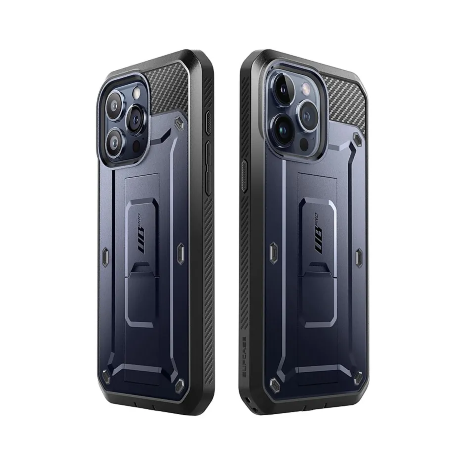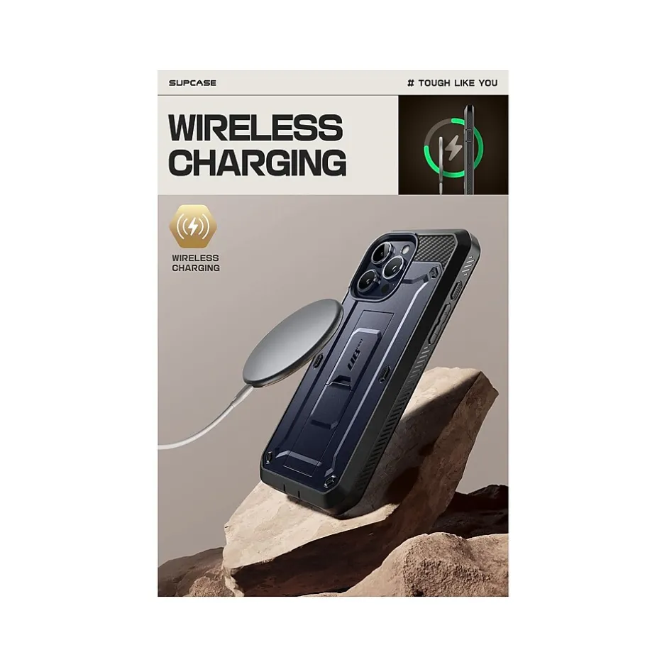 The SUPCASE Unicorn Beetle PRO rugged case ensures full-body protection for your iPhone 15 Pro Max (6.7″ screen). Features a dual-layer unbending polycarbonate back and impact-resistant TPU bumper. Port plugs keep out dust and debris.