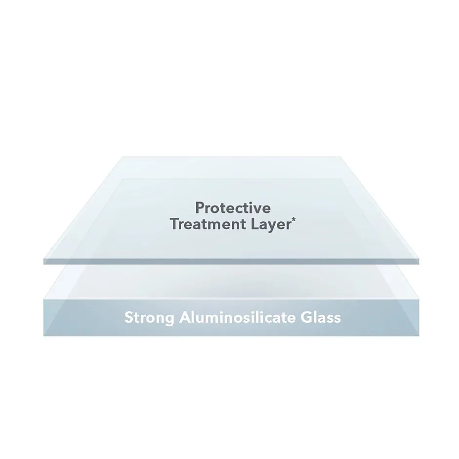 - Aluminosilicate glass used undergoes an ion exchange tempering process, which increases the surface tension of the glass, making it stronger and more scratch-resistant