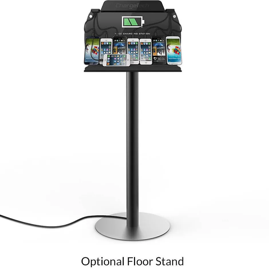 ChargeTech’s Wall Mount & Table Top Charging station is the best, most simple space-saving charging station solution available to help drive and keep traffic to your business as well as increasing guest satisfaction. It’s the perfect solution for any industry such as healthcare, education, hospitality, entertainment, retail, trade shows, and more. Features eight industrial-grade braided charging cables (three Apple lightning for iPhone 5 and newer, four Micro-USB for android, and one Type-C for newer devices), LED lighting, and an easy to change billboard to display your company’s or sponsor’s marketing. Is primarily wall mounted using included hardware, or mounted on top of a table with the purchase a table mount kit. Model: WM9.