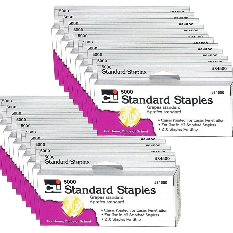 High-quality, precision-made staples fit all standard size staplers. Chisel-pointed for sure entry. 210 Staples per strip. Convenient hand tab box. Each box includes 5000 staples. Sold as 20 boxes for a total of 100,000 staples.