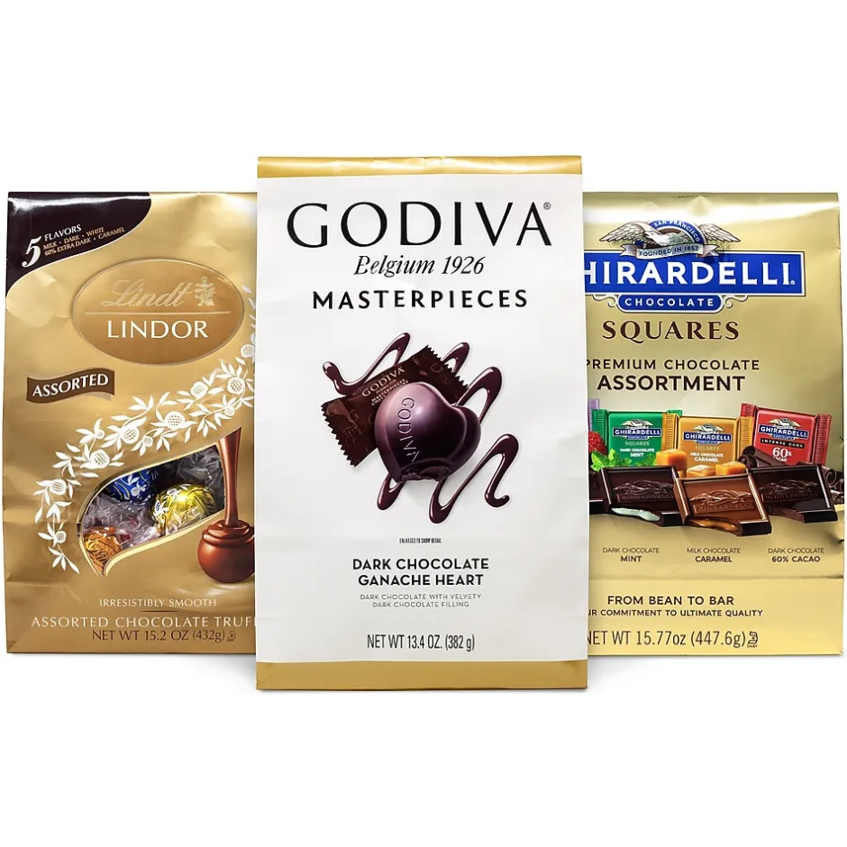 - Includes: 15.2 oz Lindt Assorted Truffles Platinum Bag (milk, dark, white), 13.4 oz bag of Godiva Masterpieces Dark Chocolate Ganache Hearts and 15.77 oz bag of Ghirardelli Premium Assortment Chocolate Squares (Dark & Raspberry, Dark & Mint, Milk & Caramel, 60% Cacao)