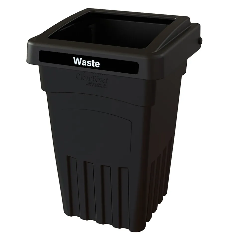 The CleanRiver BevvyBin is a compact and sturdy 8 gal. bin that is perfect for office, health-care, dorm use, or residential situations. The hinged lid makes it easy to service, and the unique bag tie system prevents waste spills, especially when heavy organic waste is collected.