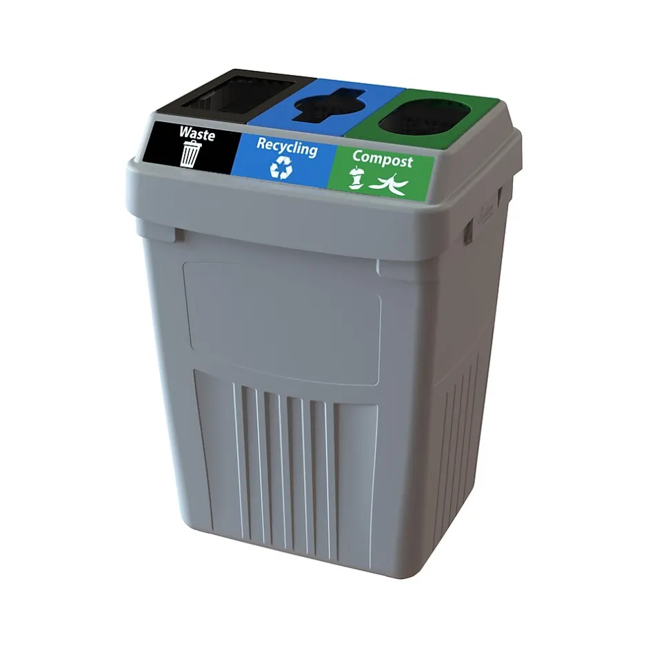 Collect up to three different streams of waste and recycling in CleanRiver Flex E 50 gal. bins that change when you need them to. Go from single-stream to double-stream to multi-stream in a snap, no tools required. Transition technology allows you to add or remove streams in a snap. Innovative top plates snap in place with no tools required. So you have peace of mind that your bin will change as your recycling program changes. This three-stream recycling station is made of 55% recycled high-density polyethylene (HDPE).